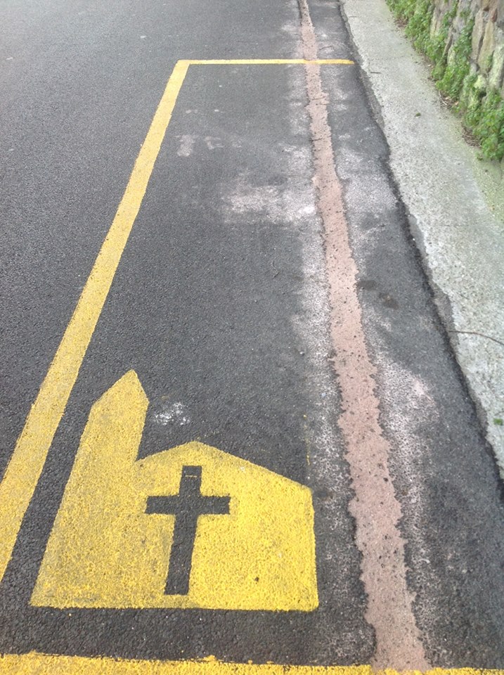 L’ultima e più che insolita conferma, a tal proposito, proviene da Ischia, grazie alla segnalazione di un abitante locale che sul suo profilo Facebook ha postato delle foto che ritraggono una chiesetta gialla disegnata sull’asfalto, con tanto di croce. Intorno tre strisce a delimitare l’area. Ovvero la segnaletica che delimitata il posto auto riservato ai sacerdoti.
