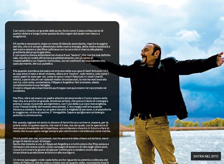 Ma Pino, oltre ad essere un padre attento ed amorevole e l’unico amore della mia vita, era anche un grande, immenso artista, che aveva il dono di coniugare anima e corpo riuscendo ad esprimere, con l’uso della sua voce meravigliosa, tutto l’inesprimibile del mondo emozionale. C’era magia nell’aria quando iniziava a cantare, fosse su un palco davanti a migliaia di persone, o al pianoforte in soggiorno, vicino al camino. E’ innegabile. Sapeva sprigionare un’energia potente e commovente.