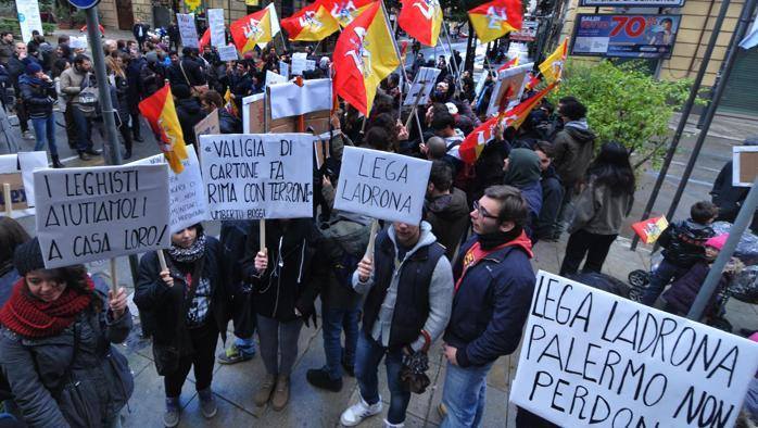 ”Salvini suca”, ”leghisti politici ladri”, ”Palermo non perdona”, ”Valigia di cartone fa rima con terrone”, ”Noi non dimentichiamo gli insulti contro la Sicilia’‘.