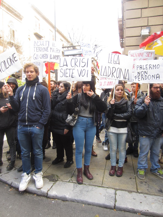 Non è servita ad intenerire i toni della contestazione la felpa bianca con la scritta «Sicilia» indossata da Salvini, che non ha potuto fare altro che tirare dritto ed intavolare l’attesa arringa davanti alla nutrita platea composta dai sostenitori del movimento «Noi con Salvini».