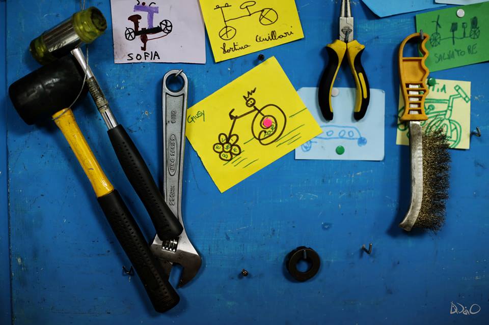 Al centro un grande tavolo da lavoro in legno massiccio, sulla destra un enorme scaffale che prende tutta la parete fino alla porta, dove sono poggiati a scomparto tanti pezzi di ricambio per le bici, vernice di ogni tipo, vite, chiodi e ogni genere di strumento. Alle spalle del tavolo una postazione in legno blu con gli attrezzi; martelli, chiavi, tenaglie, pinze, e cacciavite di varie dimensioni. Sulla parete sinistra invece una lavagna dove Chiara, una volta iniziato il lavoro, appende i bigliettini con i nomi dei bambini e il loro compito giornaliero. Il compito lo scelgono i bambini ovviamente, Chiara non impone nulla a nessuno, né nei fatti né nei modi. E’ una donna estremamente paziente e comprensiva e, pensavo, visti i tanti ragazzi, ne avrebbe avuto bisogno. Chiede ai ragazzi di sedersi a cerchio intorno al tavolo e dice a tutti che questa è una giornata speciale per la ciclOfficina, l’ultima.