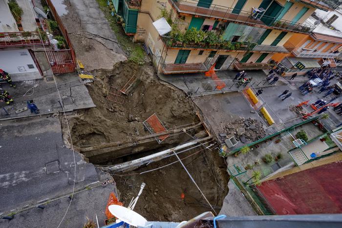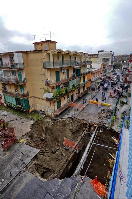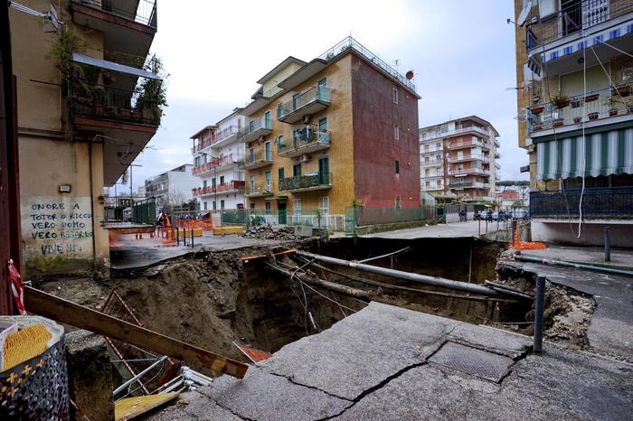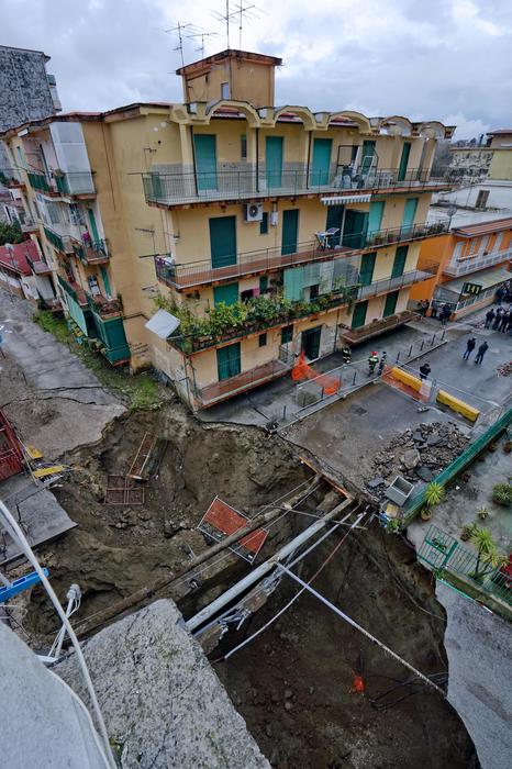 È stata la rottura di una conduttura idrica e non il persistere delle piogge abbattutesi su Napoli nella notte tra sabato e domenica, a determinare lo sprofondamento di un intero e vasto pezzo di strada in via Campanile, nel quartiere Pianura. Fin da subito, il Comune è stato chiamato ai lavori straordinari per assicurare una sistemazione alle circa 380 persone residenti nei quattro palazzi sgomberati.