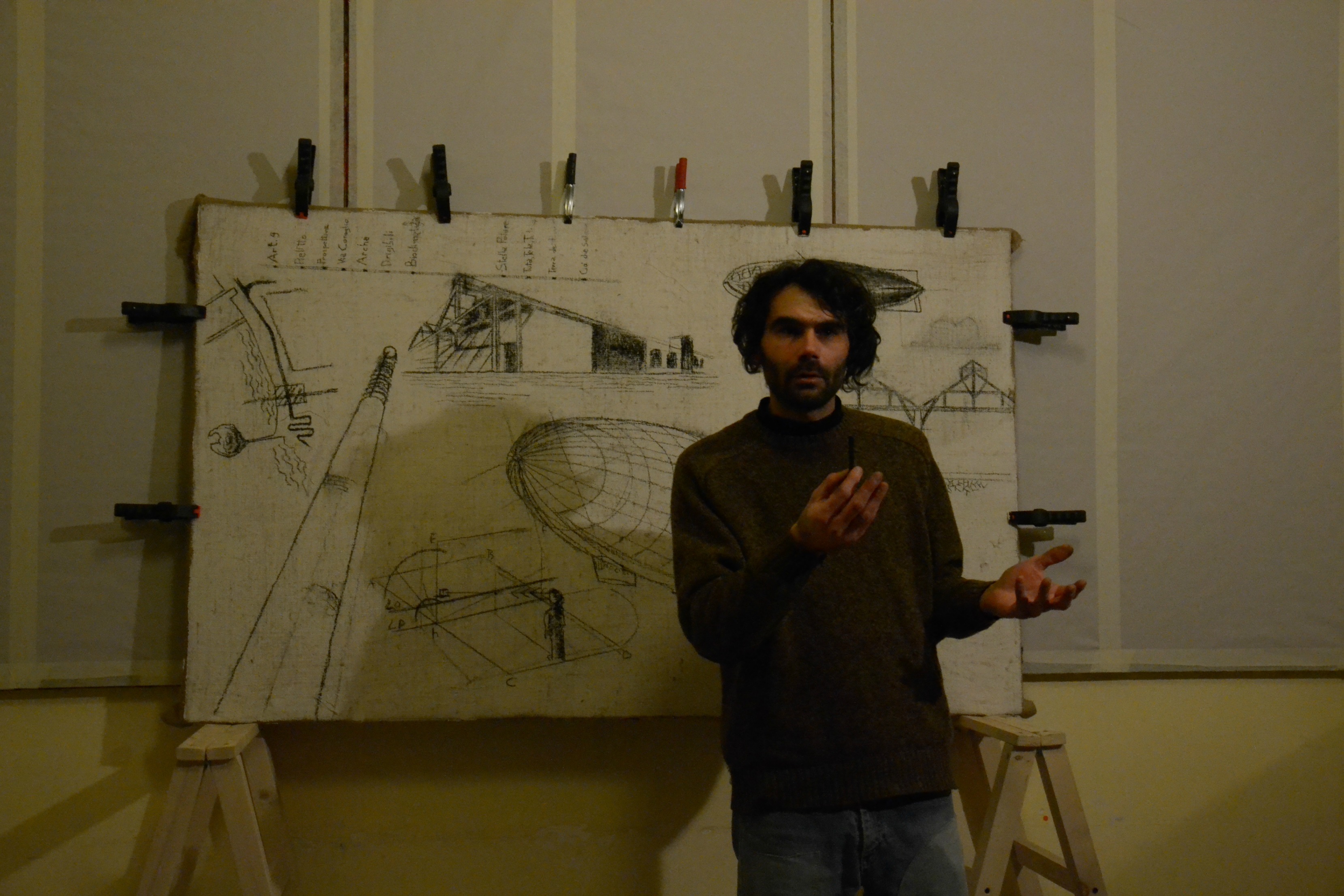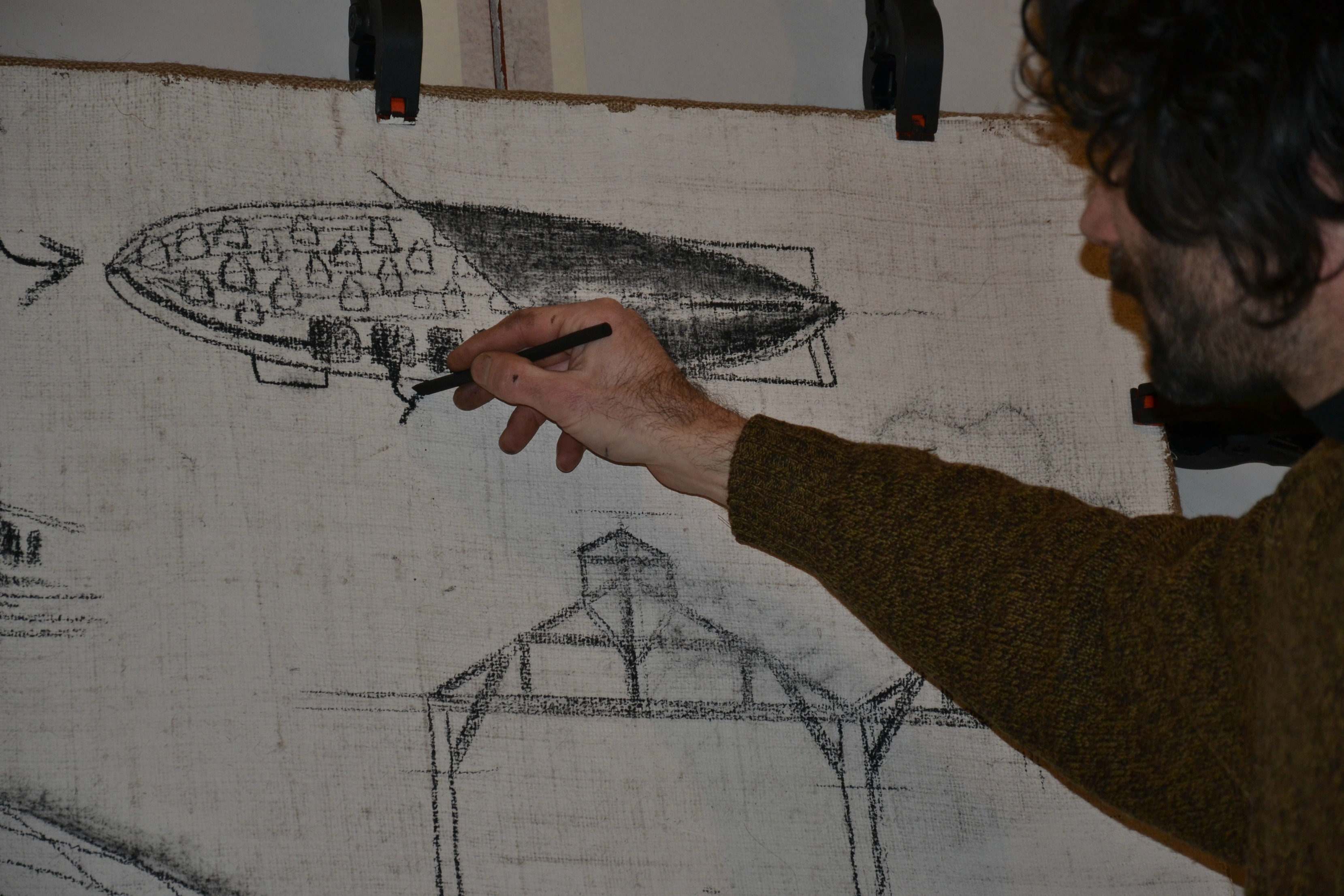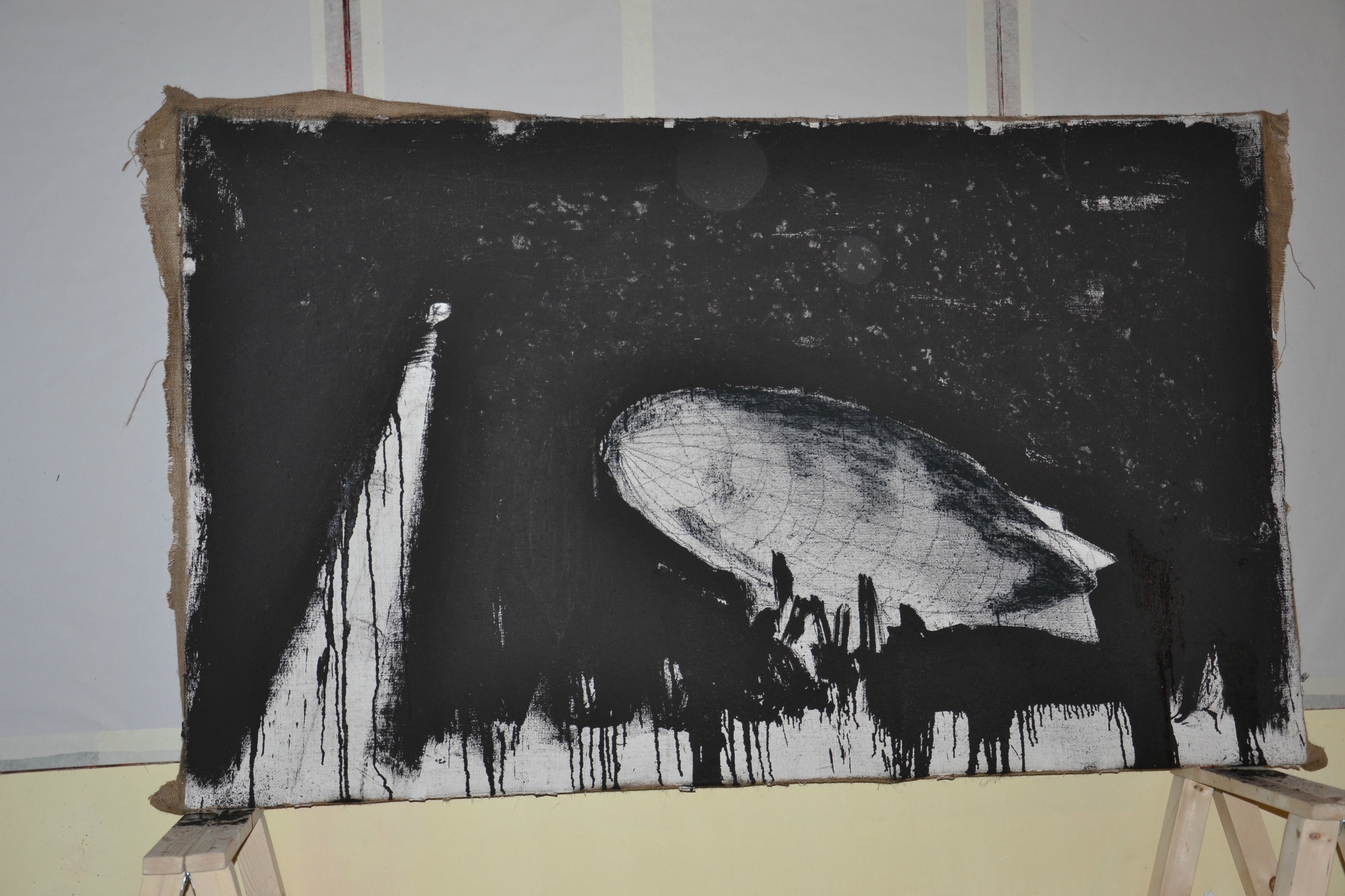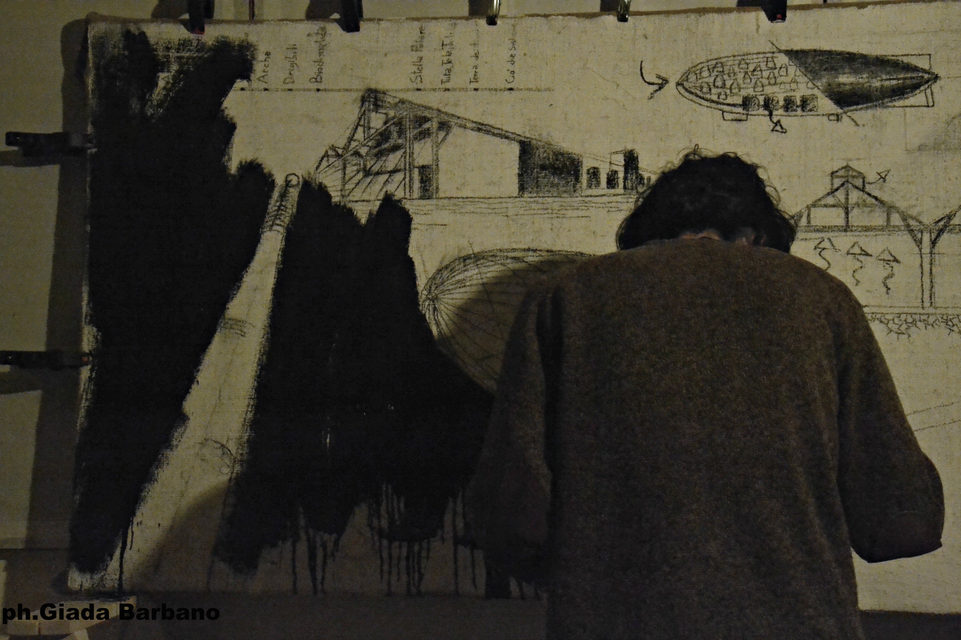 La performance– Articolo 9 della Costituzione italiana: “La Repubblica promuove lo sviluppo della cultura e la ricerca scientifica e tecnica.Tutela il paesaggio e il patrimonio storico e artistico della Nazione”. Così esordisce Francesco De Siena, un artista con una solida formazione filosofica. Un articolo formato da poche ed ovvie parole, quasi “di terz’ordine” eppure non scontato. In quella notte del 4 febbraio fu messo in discussione, anzi: fu divorato dalle fiamme insieme ai capannoni di Città della Scienza. La sua è una tela ancora “in bianco e nero”alle 20.55: si notano un capannone in lontananza, il mare, un dirigibile, una ciminiera con una lanterna sulla cima. L’enigma viene presto risolto. Città della scienza ha molto in comune con l’ingegneria nautica: viene costruita ristrutturando un capannone chimico nel 1853, sembrava quasi un relitto, una nave rovesciata in via Coroglio, non lontana dalla costa. Ben presto ,però, gli ingegneri capiscono che “la struttura dialoga più con l’aria che con l’acqua”. Scatta il piano di riqualificazione: si sostituiscono le pareti del capannone con enormi vetrate, si toglie sostegno a favore della sostenibilità: “ora l’effetto è palpabile, la struttura respira”. Da qui i riferimenti al dirigibile che si libra nel cielo grazie a scambi di pressione, al principio bioclimatico, all’etica geometrica che sottende il progetto di Città della Scienza e all’etica “andata in fumo “nel rogo. Quello che si vede in primo piano non è un dirigibile normale: è il dirigibile ” Italia”, guidato da Umberto Nobile, in quella famosa spedizione del polo Nord andata a male. E’ un altro fantasma e la tuta di Nobile era anche conservata a Città della Scienza: “la tuta che è tutela del corpo così come la tela è custode della verità”. Bastano 12 minuti (il tempo del rogo) e quella tela si trasforma: la vernice nera copre tutto lo sfondo, restano solo il dirigibile e la ciminiera in primo piano, che quasi vengono coperti da quel nero avvolgente. Sembrano corrosi, divorati dalle fiamme. La performance si chiude nuovamente con l’articolo 9, questa volta in senso volutamente ironico: quella notte non ci fu alcuna tutela del patrimonio nazionale.