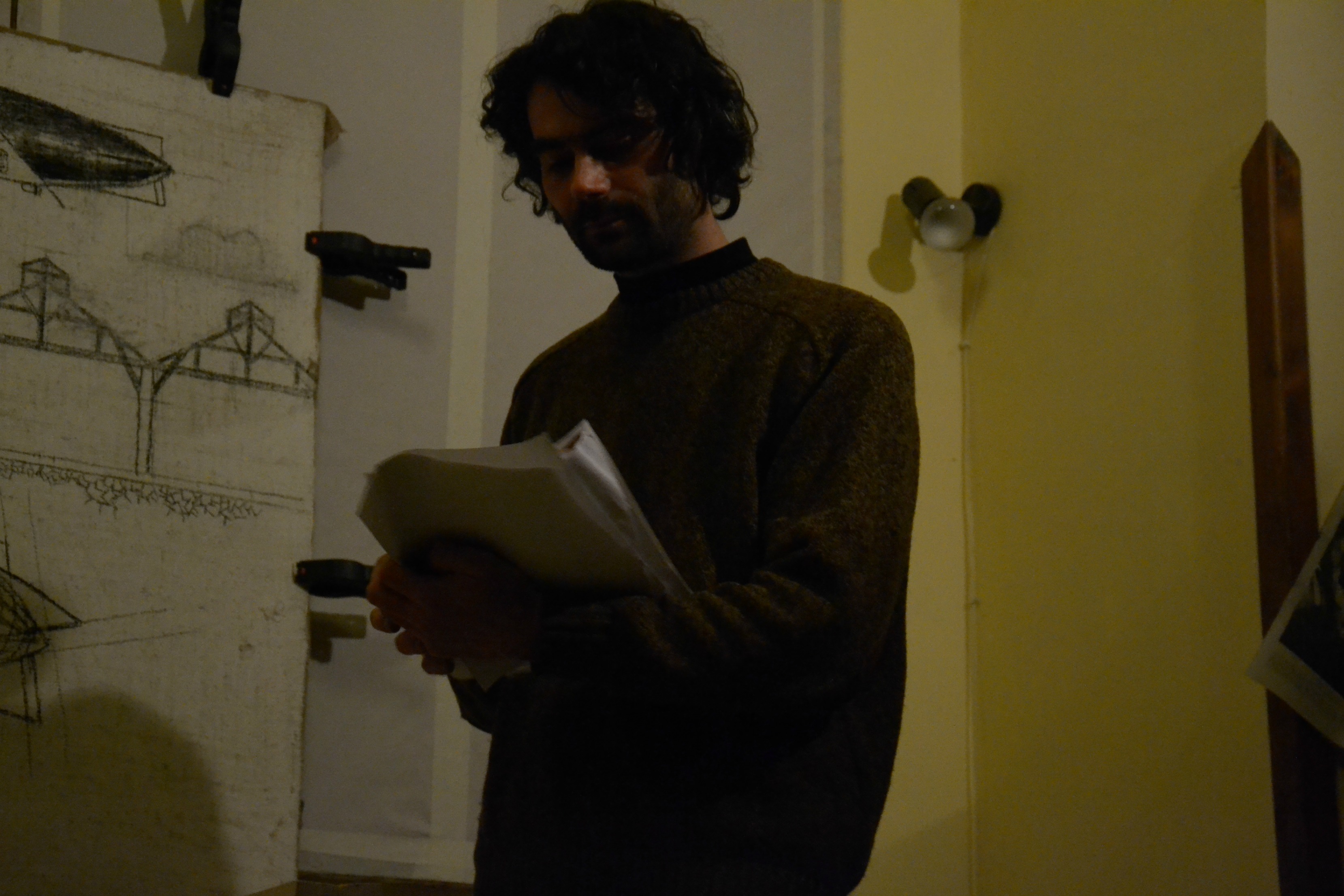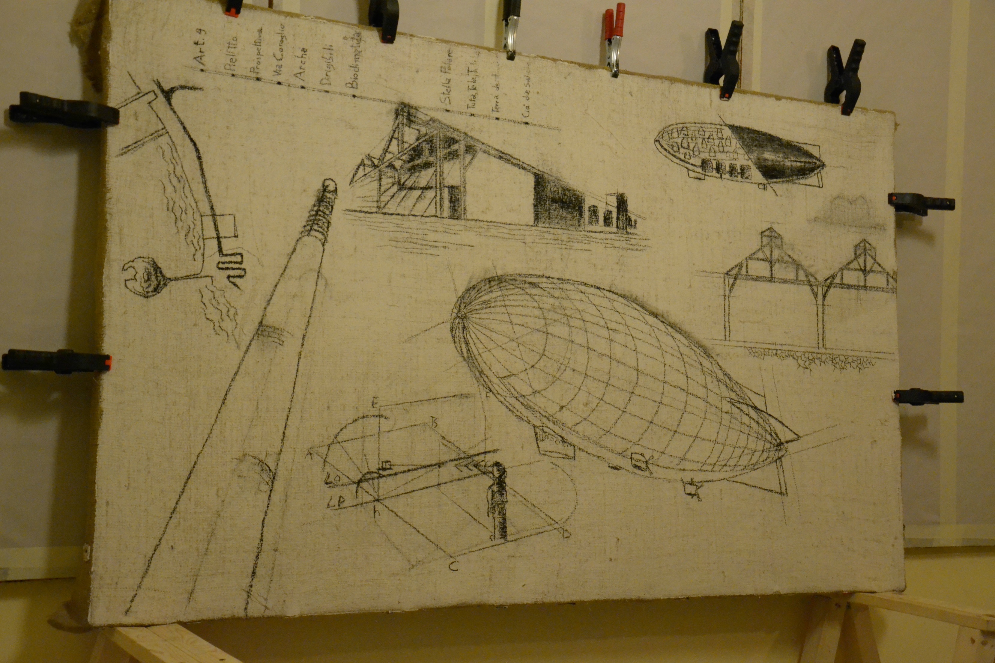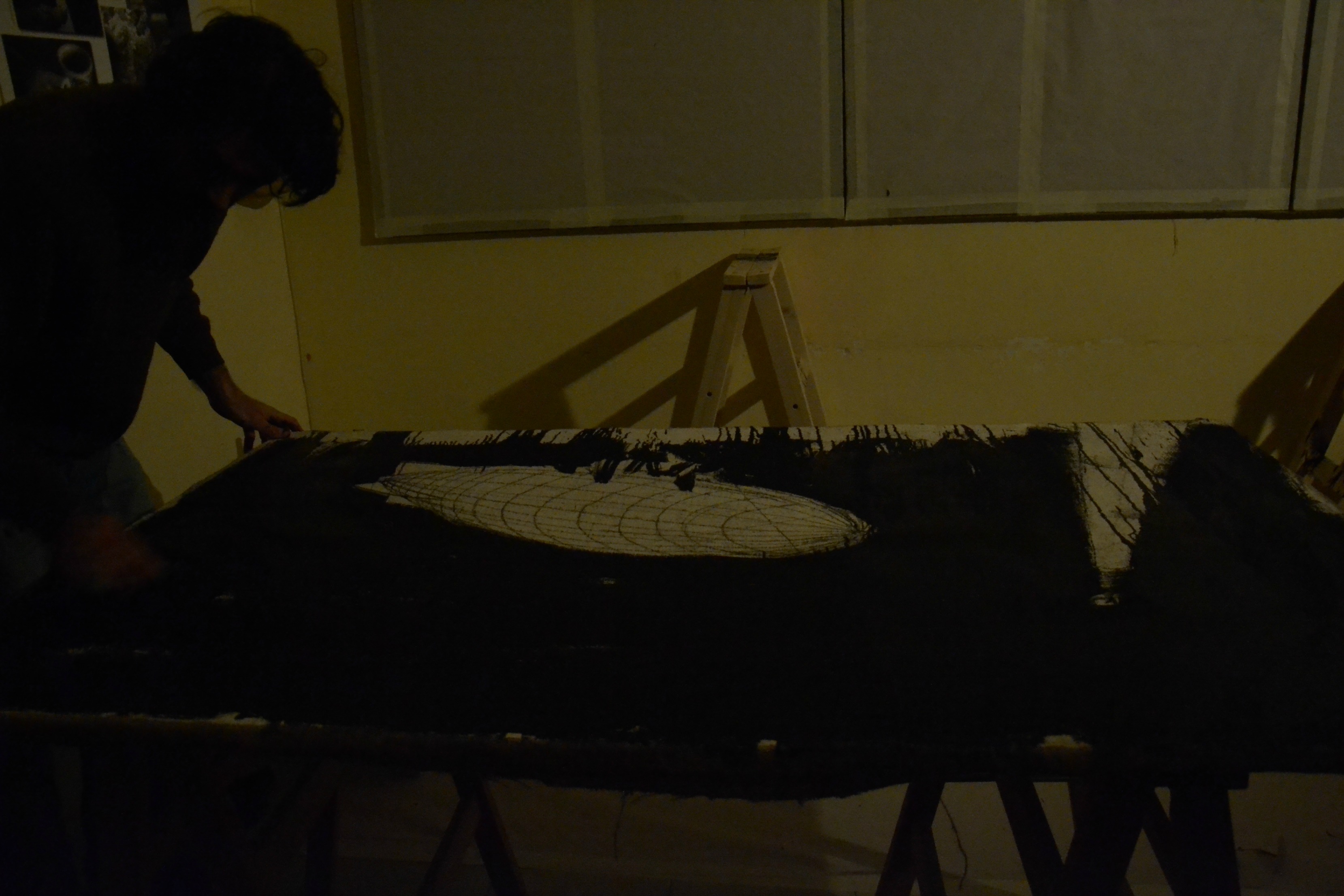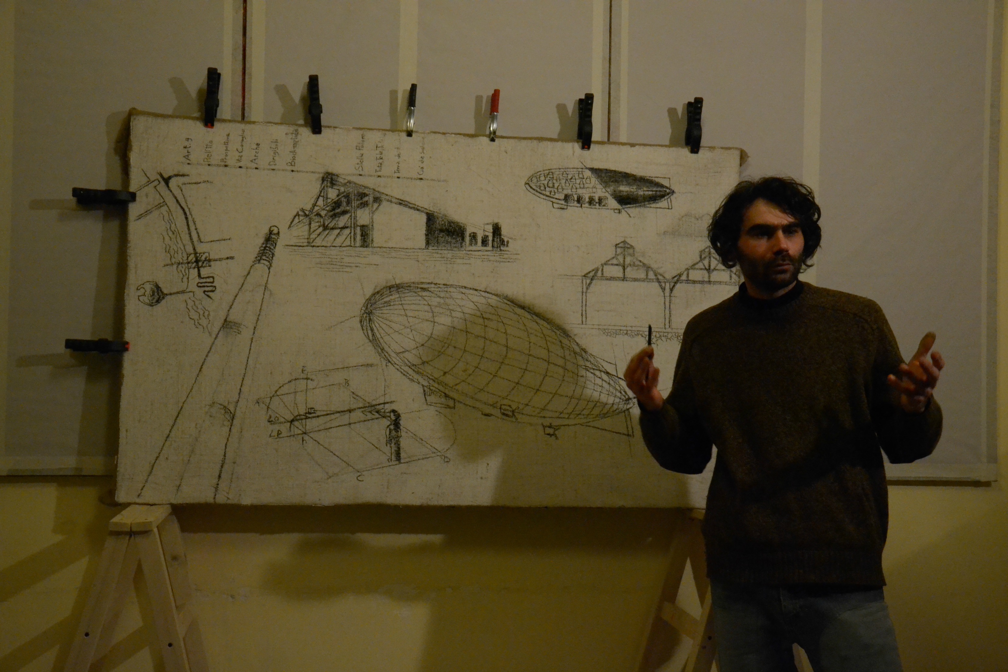 La performance– Articolo 9 della Costituzione italiana: “La Repubblica promuove lo sviluppo della cultura e la ricerca scientifica e tecnica.Tutela il paesaggio e il patrimonio storico e artistico della Nazione”. Così esordisce Francesco De Siena, un artista con una solida formazione filosofica. Un articolo formato da poche ed ovvie parole, quasi “di terz’ordine” eppure non scontato. In quella notte del 4 febbraio fu messo in discussione, anzi: fu divorato dalle fiamme insieme ai capannoni di Città della Scienza. La sua è una tela ancora “in bianco e nero”alle 20.55: si notano un capannone in lontananza, il mare, un dirigibile, una ciminiera con una lanterna sulla cima. L’enigma viene presto risolto. Città della scienza ha molto in comune con l’ingegneria nautica: viene costruita ristrutturando un capannone chimico nel 1853, sembrava quasi un relitto, una nave rovesciata in via Coroglio, non lontana dalla costa. Ben presto ,però, gli ingegneri capiscono che “la struttura dialoga più con l’aria che con l’acqua”. Scatta il piano di riqualificazione: si sostituiscono le pareti del capannone con enormi vetrate, si toglie sostegno a favore della sostenibilità: “ora l’effetto è palpabile, la struttura respira”. Da qui i riferimenti al dirigibile che si libra nel cielo grazie a scambi di pressione, al principio bioclimatico, all’etica geometrica che sottende il progetto di Città della Scienza e all’etica “andata in fumo “nel rogo. Quello che si vede in primo piano non è un dirigibile normale: è il dirigibile ” Italia”, guidato da Umberto Nobile, in quella famosa spedizione del polo Nord andata a male. E’ un altro fantasma e la tuta di Nobile era anche conservata a Città della Scienza: “la tuta che è tutela del corpo così come la tela è custode della verità”. Bastano 12 minuti (il tempo del rogo) e quella tela si trasforma: la vernice nera copre tutto lo sfondo, restano solo il dirigibile e la ciminiera in primo piano, che quasi vengono coperti da quel nero avvolgente. Sembrano corrosi, divorati dalle fiamme. La performance si chiude nuovamente con l’articolo 9, questa volta in senso volutamente ironico: quella notte non ci fu alcuna tutela del patrimonio nazionale.