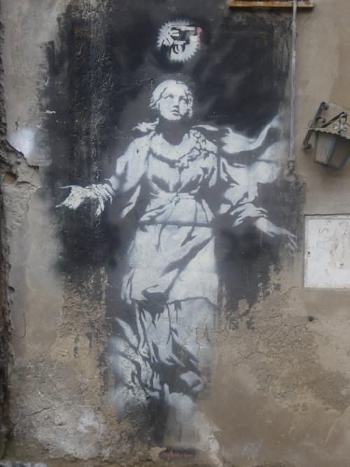 Un artista nato a Bristol nel 1974, irriverente, dissacratorio nei confronti degli stereotipi della società odierna, “il re dei graffiti”: sono queste le uniche notizie che si conoscono sulla sua identità. Eppure le sue opere parlano chiaro: no all’establishment, all’abuso di potere, alla guerra e al consumismo. Slogan già sentiti, ma sistematicamente ignorati. Una personalità enigmatica, nota per le sue incursioni nei musei, dove ripropone accanto a dipinti famosi, opere simili modificate sarcasticamente ( come la Gioconda con il viso coperto da uno smile che appese di nascosto al Louvree). E’ stato anche a Napoli dove ha realizzato ,in Via Benedetto Croce, uno stencil che rappresentava una reinterpretazione della Santa Teresa del Bernini con in mano delle patatine e un panino, simboli del consumismo. L’opera è stata cancellata nel maggio 2010 da Hes, un writer napoletano che l’ha coperta con un enorme murales. In Piazza dei Gerolomini, poco distante da Via Benedetto Croce, è ancora visibile “la Madonna con la pistola”