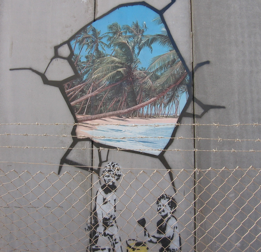 Nel febbraio 2015, come dimostra un video pubblicato sul suo sito, entra nella Striscia di Gaza tramite dei tunnel sotterranei, risale in superficie attraverso una porta di metallo e lascia quattro tracce del suo passaggio. Il primo graffito è realizzato sui resti di un muro che si erge solitario in mezzo a un cumulo di macerie: è un uomo intento a pensare, con una mano sul capo, ispirato a “Il pensatore” di Auguste Rodin; Un uomo logorato dai suoi pensieri e dalla guerra, rinchiuso nella prigione della sua mente e in un angusta cornice rossastra: un’ immagine perfetta per rappresentare Gaza; questo perché, secondo Banksy “Gaza è spesso descritta come la prigione all’aria aperta più grande del mondo perché nessuno può entrare o uscire; ma ciò sembra davvero poco gentile nei confronti delle prigioni, perché qui non hanno elettricità e bevono acqua recuperata a caso tutti i giorni” .