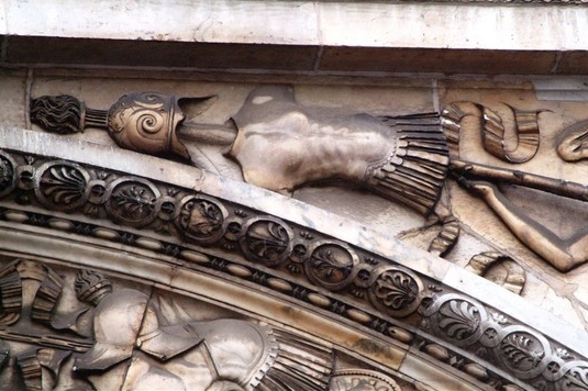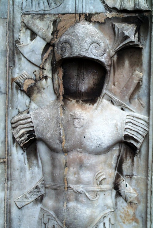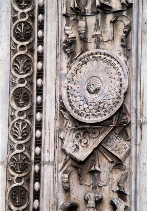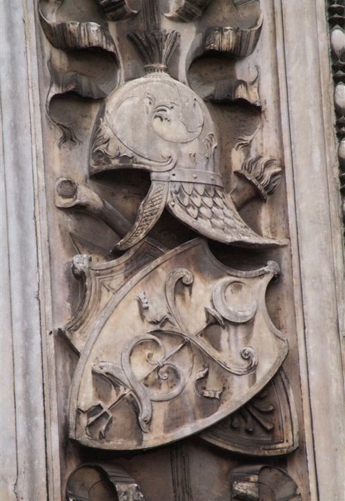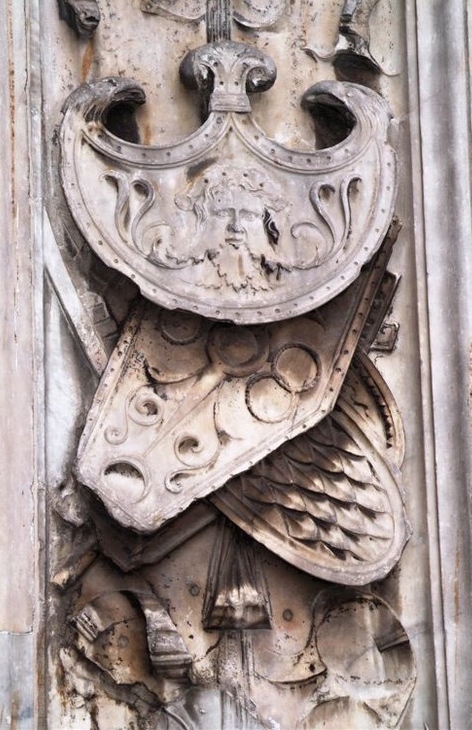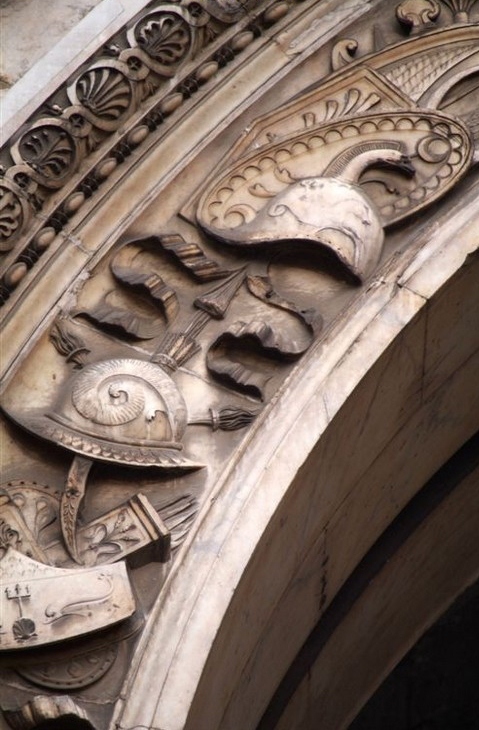 Il da Maiano studiò un sistema molto semplice, eppure elegante ed imponente. La porta si organizza su due pilastri laterali in stile corinzio, su cui s’accosta il fornice dell’arco decorato con un bassorilievo scolpito con trofei d’armi: elmi, corazze, spade e scudi, tutto avvolto in nastri che si interrompono in cima all’arco, nel cui centro campeggia la cosiddetta chiave dell’arco che segna il punto equidistante tra le due parti, per poi proseguire nel lato opposto.