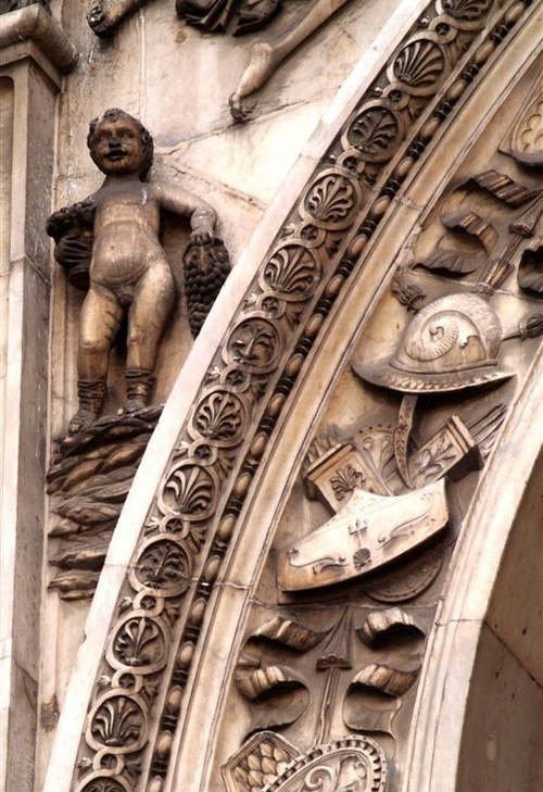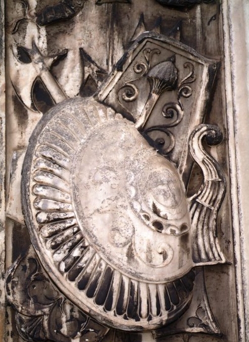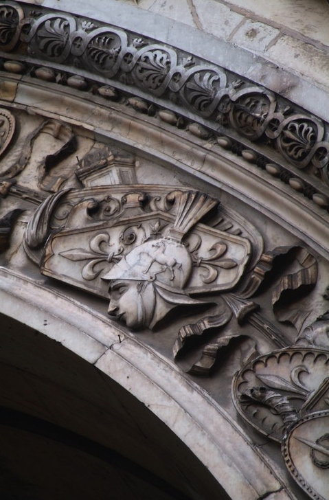 In cima la struttura è sormontata da un cornicione ed un attico dalle dimensioni di novanta centimetri, tutto in marmo bianco e decorato con gigli.