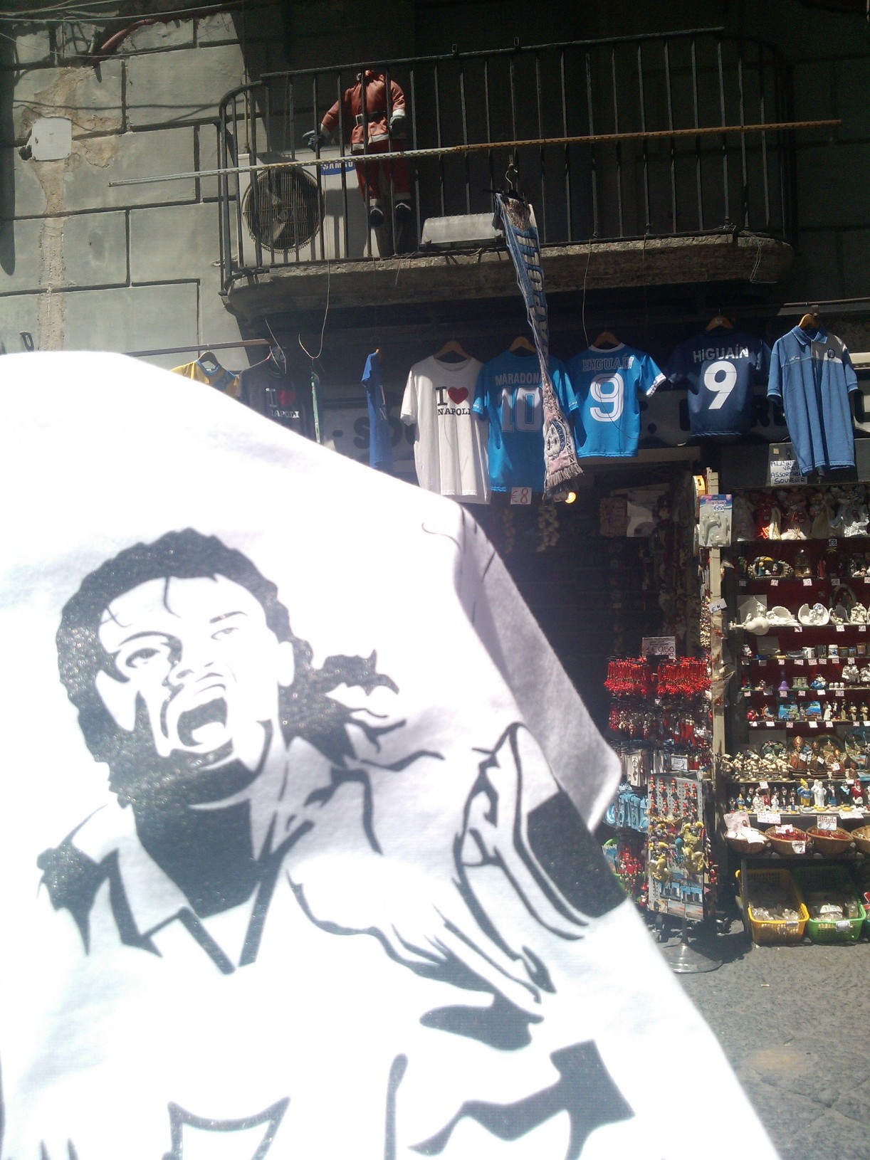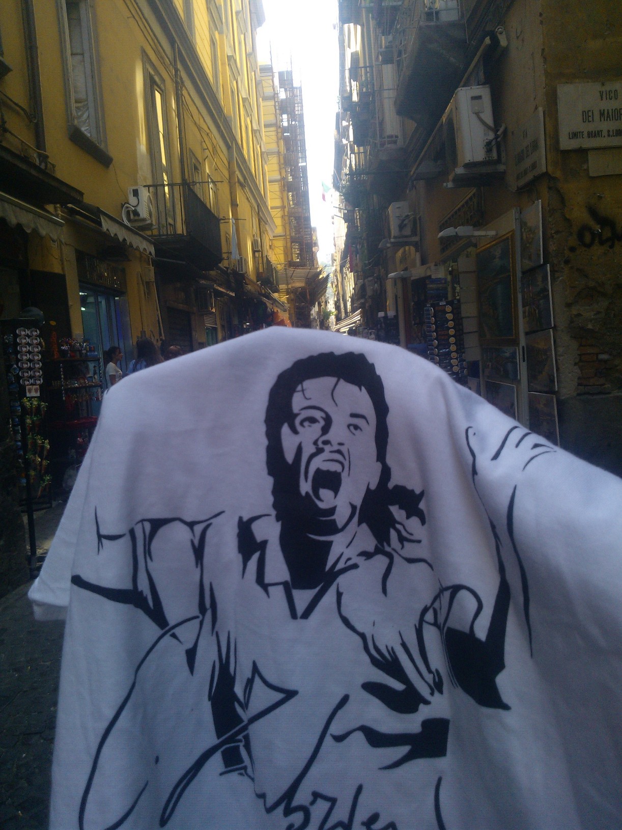 Napoli, il centro storico, Spaccanapoli, i vicoli della tradizione artigiana, frammisti a tante icone ed orpelli che consentono alla passione che infervora l’amore per il calcio di sventolare e riecheggiare nei meandri della quotidianità, divenendo una consueta ed, al contempo, eterna parte delle nostre vite.