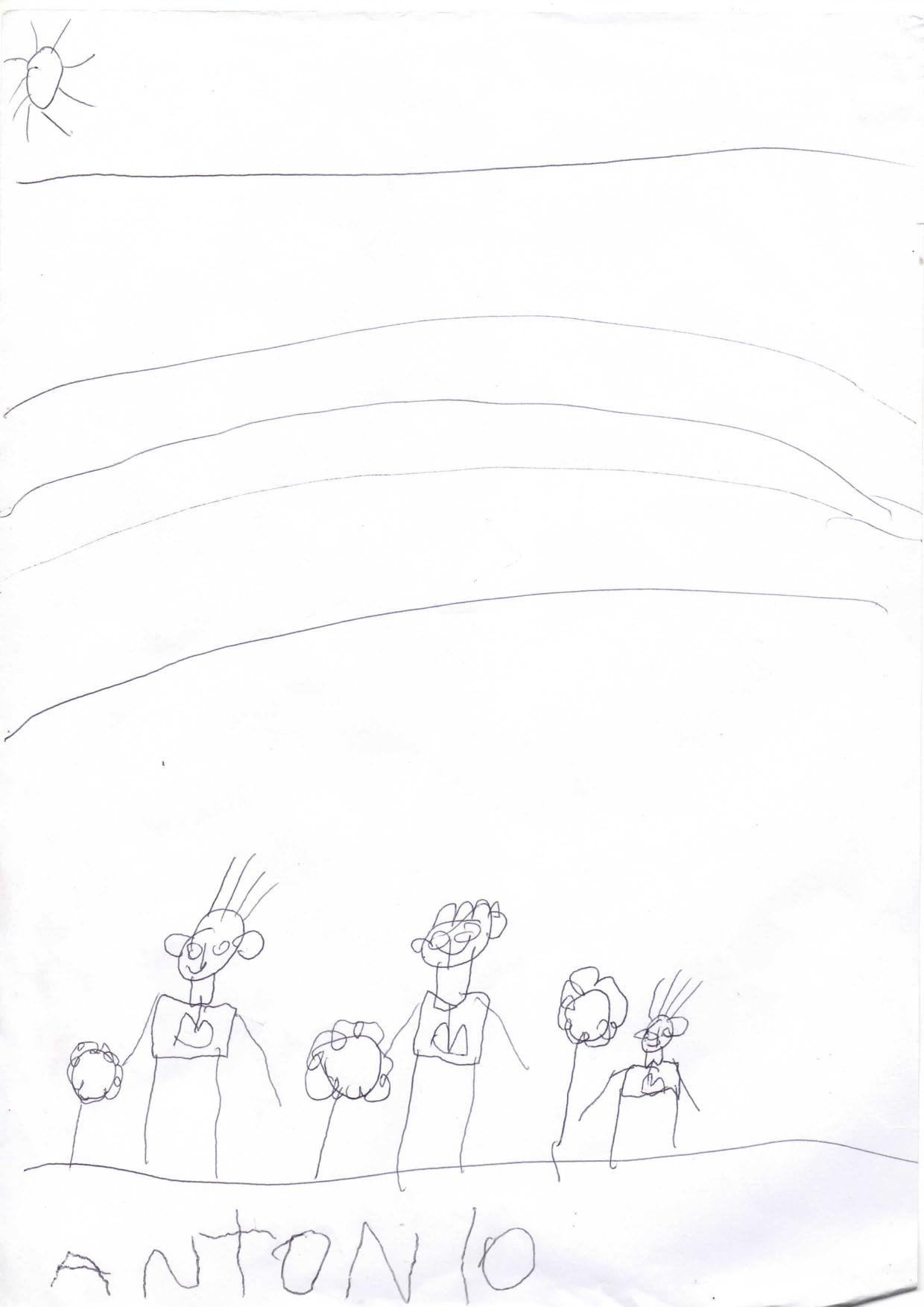 Eppure, Milone nutre una sconfinata passione per le buche ed è un ottimo “cacciatore d’insetti”, di qualsiasi genere e specie; Antonio e suo fratello Vincenzo mi hanno insegnato che gli anni, quando sei bambino, si contano in base alle abilità. Antonio sa disegnare e scrivere solo il suo nome, mentre Vincenzo è talmente piccolo che non sa neanche disegnare, ma sta imparando. Mario trascorrerebbe interminabili ore a disegnare il mondo che vive dentro di lui. Disegna emozioni, inconsapevole di farlo, come solo e soltanto un bambino può essere in grado di fare. Poi c’è Luciano, lui si definisce “un bambino cattivo”, allora, per indurlo ad impugnare foglio e matita è necessario inscenare una pantomima che lo porta ad assumere l’atteggiamento di chi ti sta facendo un favore, per non sminuire la sua fama di “bad boy”, inconsapevole della tenerezza che trapela dagli alberi e da sole che sorride che accolgono quel bambino, scalfito nei suoi disegni. Rosa è la sorellina di Raffaele, un bimbo vivacissimo e già scaltro, lei se ne prende cura, ma non è mai troppo impegnata da non poter buttare giù qualche riga o colorare un disegno che ritragga una di quelle scene che dondolano, tra realtà e fantasia.