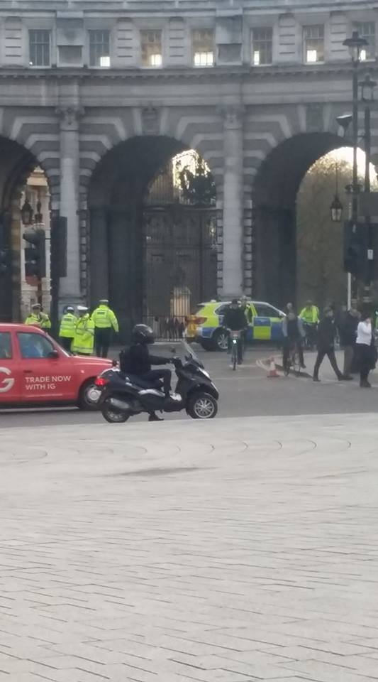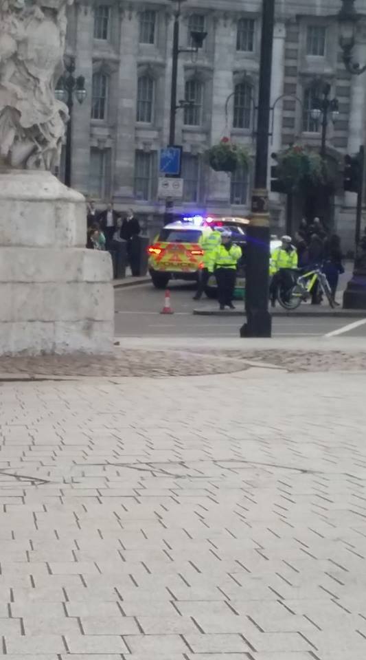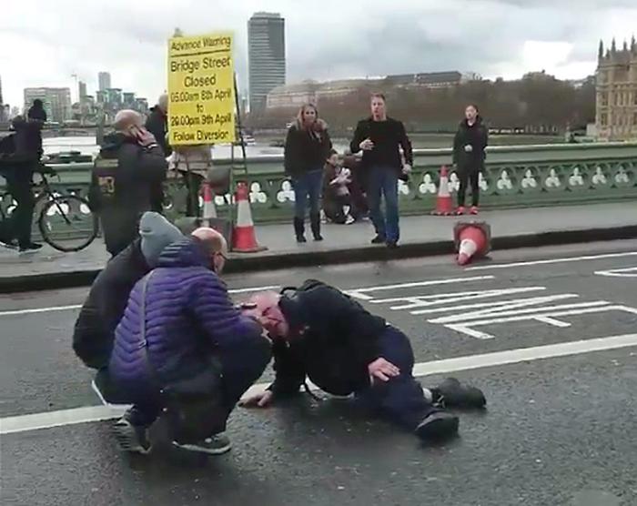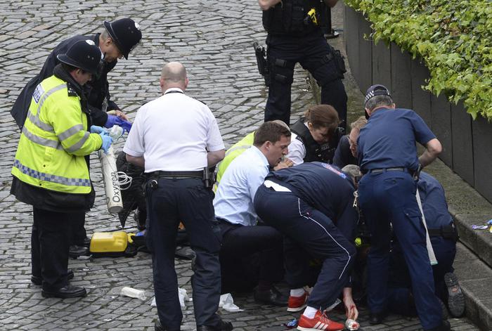 Emergency services at the scene outside the Palace of Westminster, London, Wednesday, March 22, 2017. London police say they are treating a gun and knife incident at Britain’s Parliament “as a terrorist incident until we know otherwise.” The Metropolitan Police says in a statement that the incident is ongoing. It is urging people to stay away from the area. Officials say a man with a knife attacked a police officer at Parliament and was shot by officers. Nearby, witnesses say a vehicle struck several people on the Westminster Bridge. (Stefan Rousseau/PA via AP).
