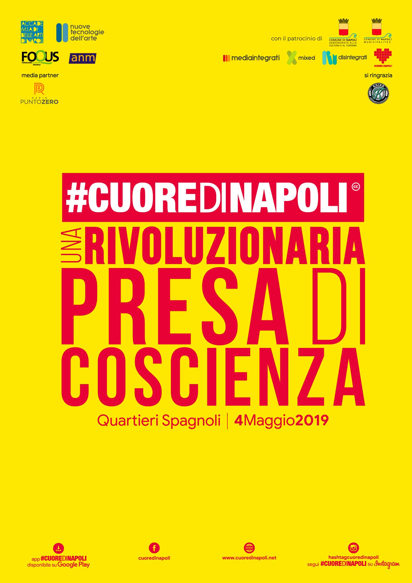 Il progetto artistico #CUOREDINAPOLI, realizzato ormai con cadenza annuale dal Corso di Nuove Tecnologie dell’Arte dell’Accademia di Belle Arti di Napoli, per la sua quinta edizione torna nei Quartieri Spagnoli.L’appuntamento previsto per l’evento finale, svolto in collaborazione con l’Assessorato alla Cultura e al Turismo del Comune di Napoli, la Municipalità 2 del Comune di Napoli e alcune associazioni e privati che agiscono sul territorio, avrà luogo il 4 maggio 2019.