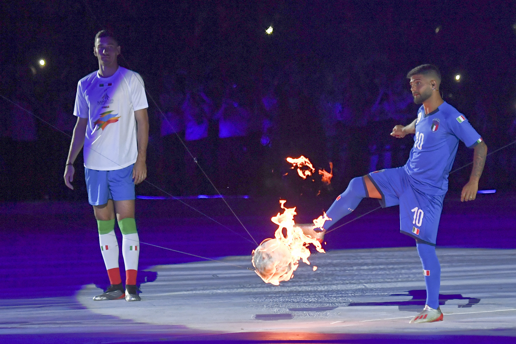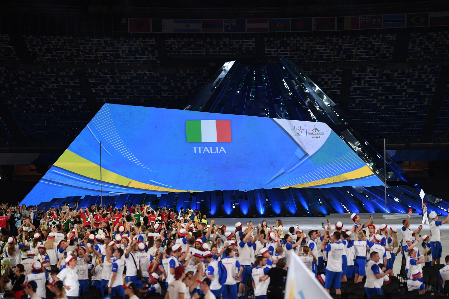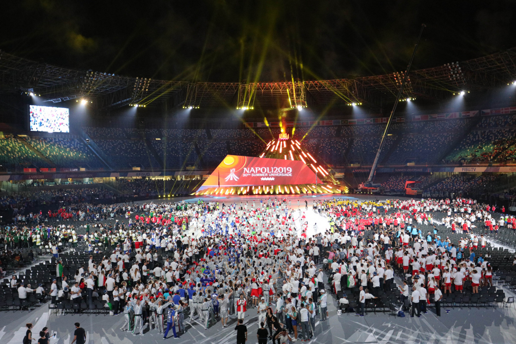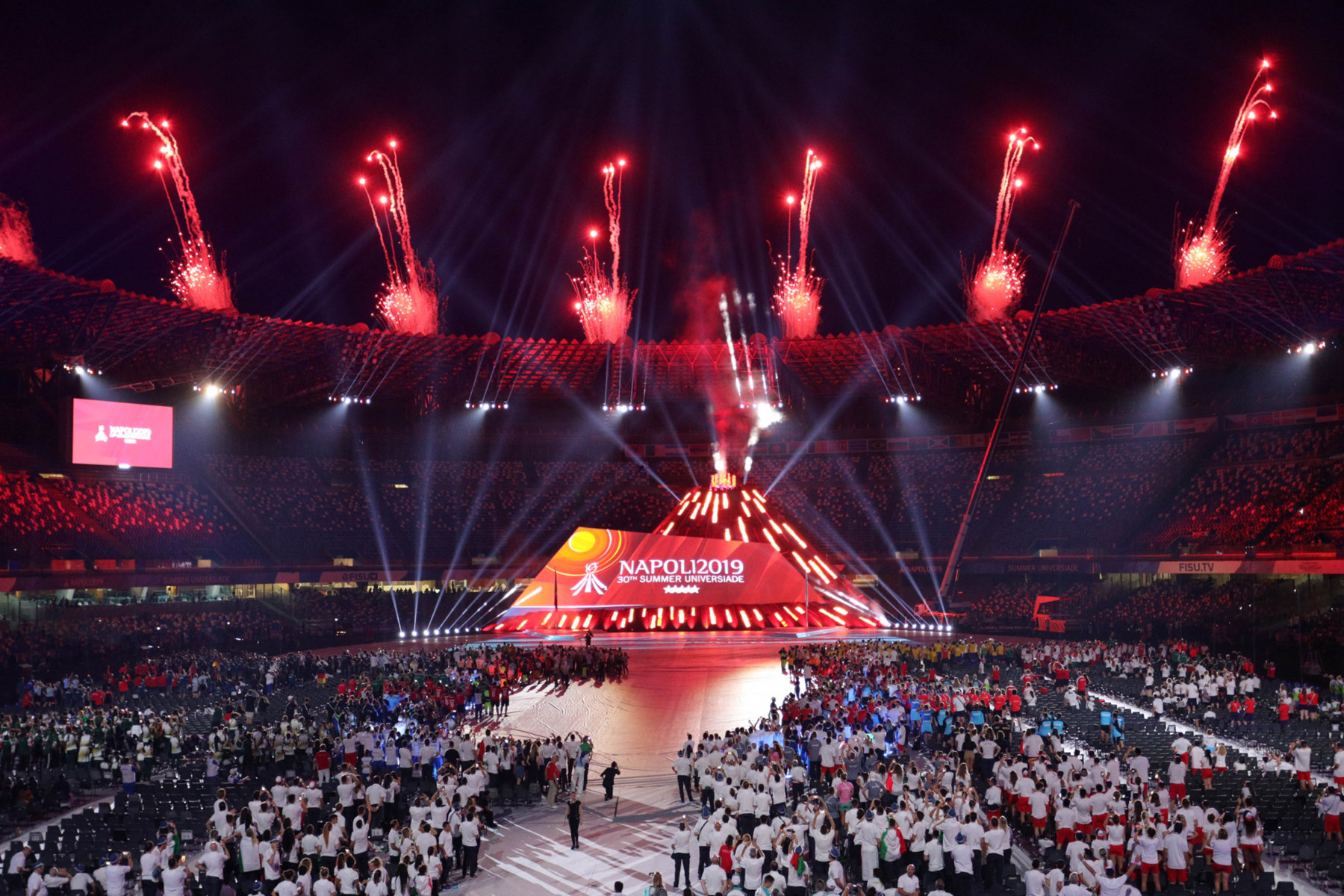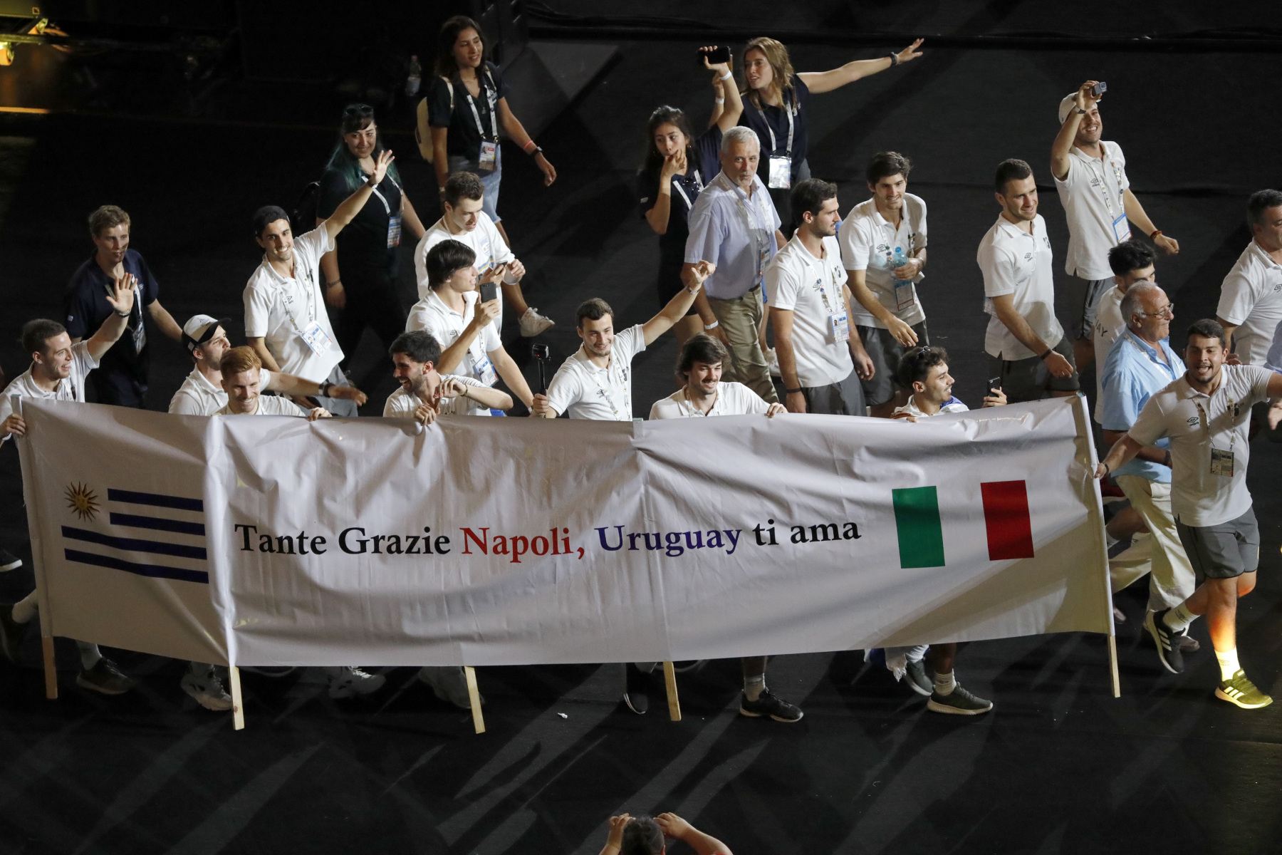 Colorata e folkloristica la sfilata delle delegazioni di tutto il mondo. Tra i protagonisti della cerimonia Napoli ha scelto di mettere in campo anche 40 rifugiati provenienti dall’Africa e dal Medio Oriente. I giovani hanno partecipato portando i cartelli con i nomi di alcuni Paesi durante la sfilata e aiutando il servizio d’ordine. Non sono mancati gli intermezzi musicali, con Malika Ayane ha cantato «L’italiano» di Toto Cutugno, mentre la fanfara dei Carabinieri ha eseguito l’Inno di Mameli, cantato in coro dal San Paolo. Il rapper Anastasio ha invece intonato una sua personale versione di «Another brick in the wall» dei Pink Floyd. E poco dopo, con il calcio a una palla di fuoco del capitano del Napoli Lorenzo Insigne, si è acceso il braciere della 30/a Universiade. Gran finale con il canto di un Bocelli in forma straordinaria.