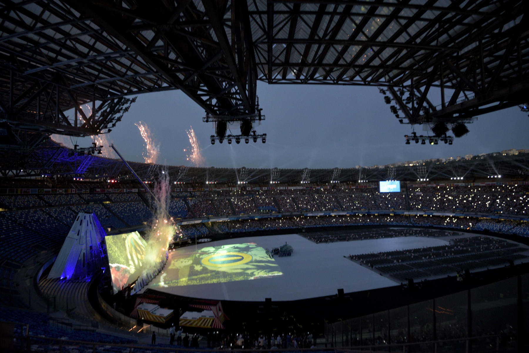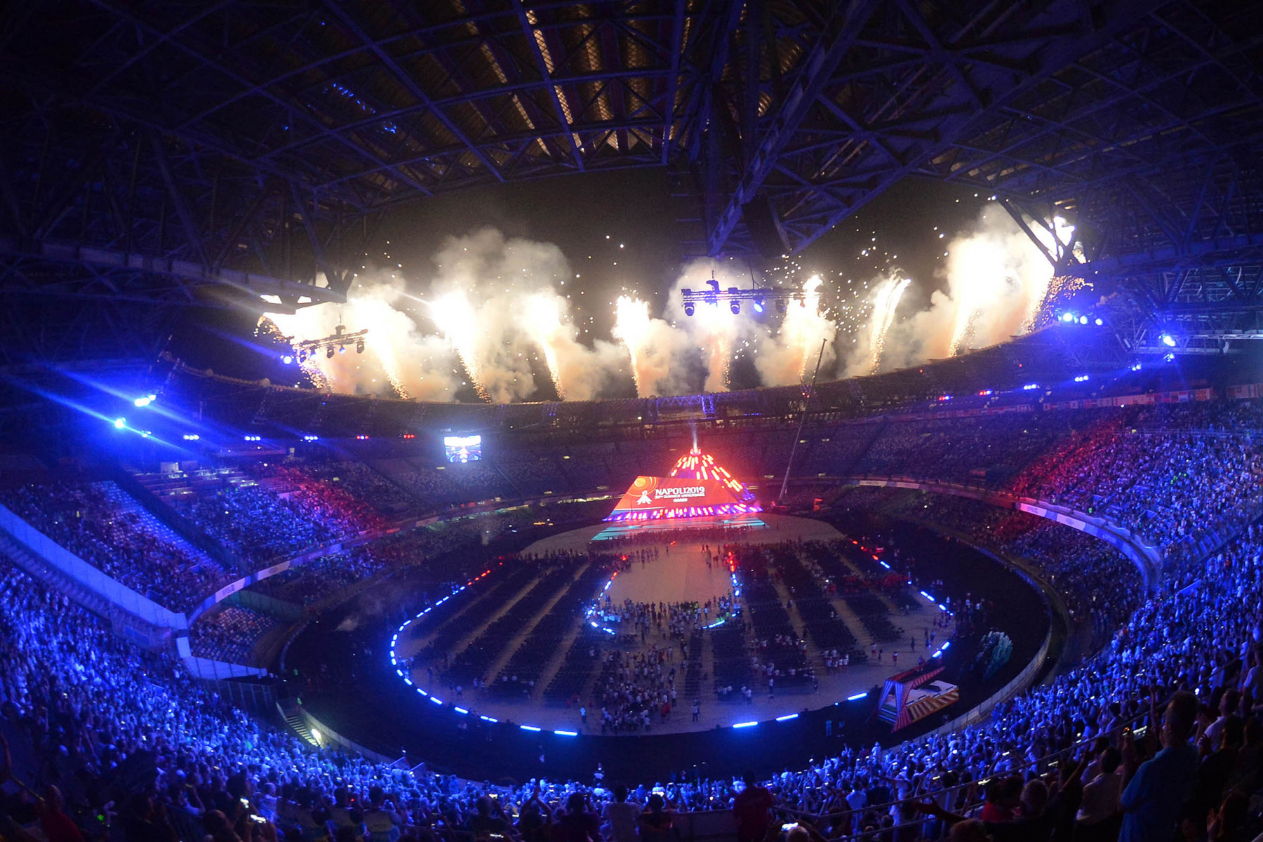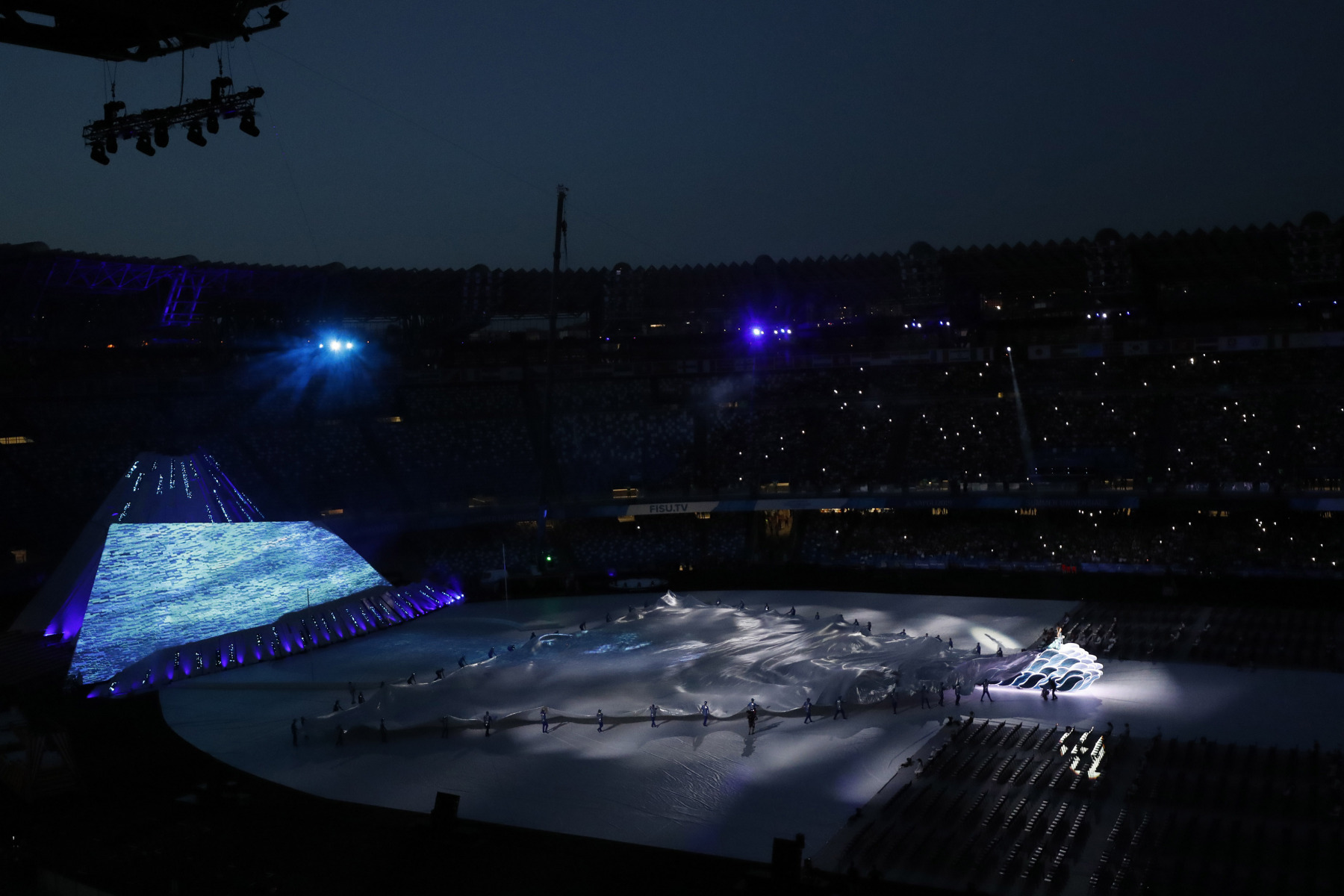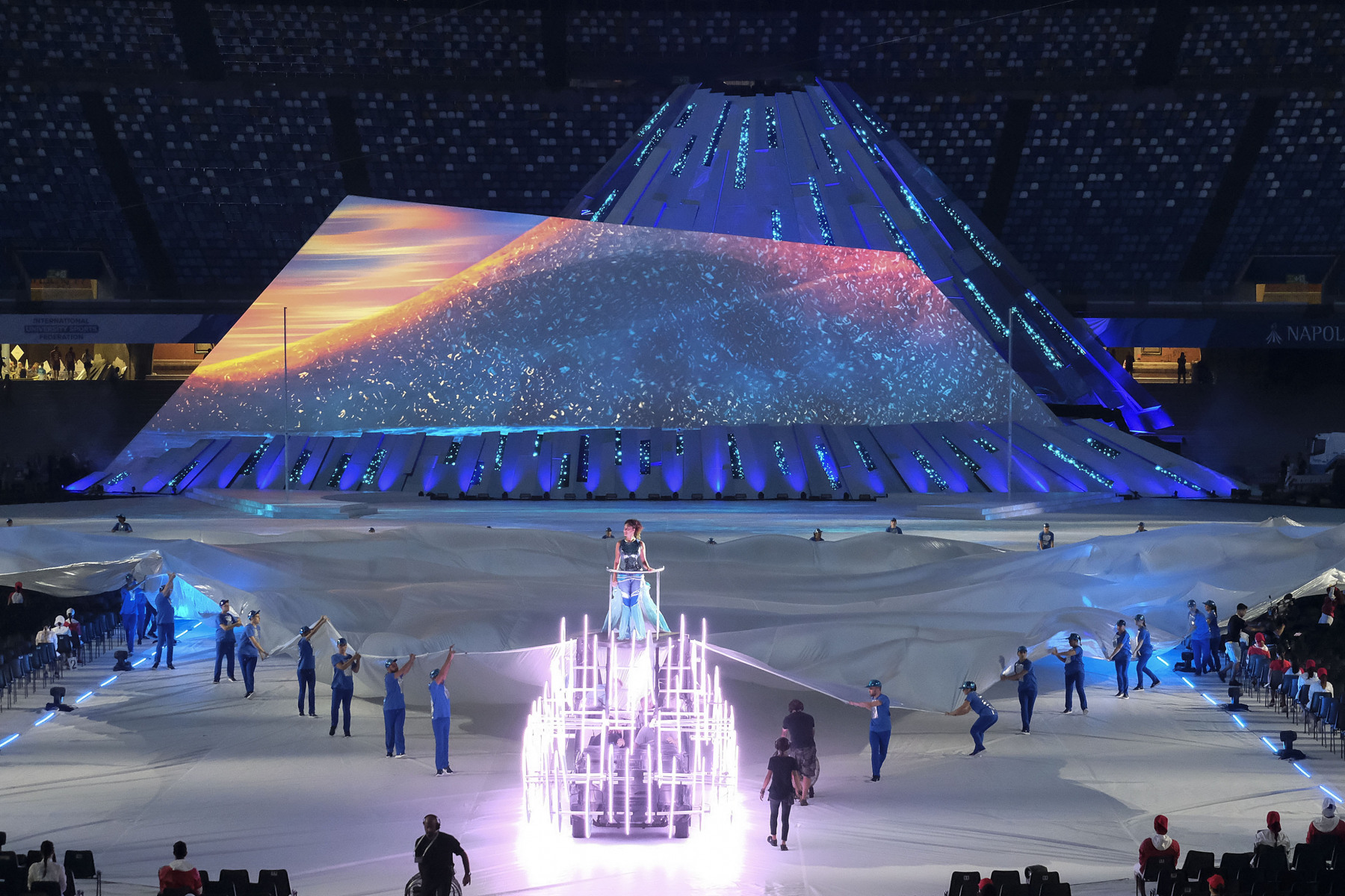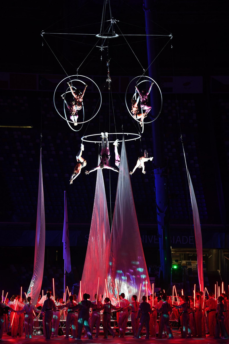 Uno show ricco di luci e suggestioni: dalla U del logo delle Universiadi, come concetto di unione, universalità e unicità, che si è accesa rappresentando due enormi braccia protese, al video countdown con i numeri della smorfia napoletana, fino al momento magico con l’ingresso di una sirena aerea, la sirena Partenope, interpretata dall’apneista partenopea Mariafelicia Carraturo. Partenope è avanzata con una coda argentata lunga 60 metri nello stadio che grazie a uno spettacolare gioco di luci ed effetti speciali, si è trasformata nel Golfo di Napoli, con il mare che ha invaso il terreno di gioco.