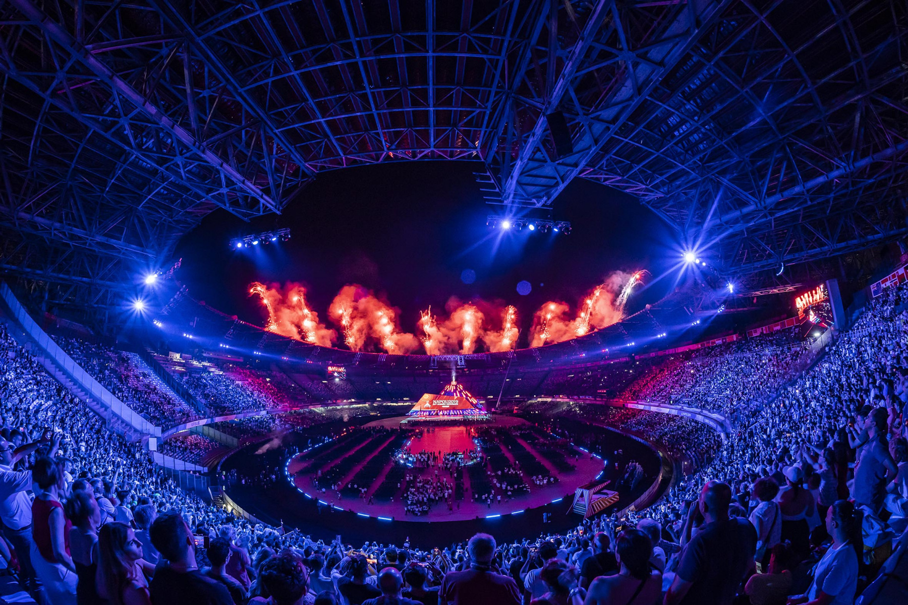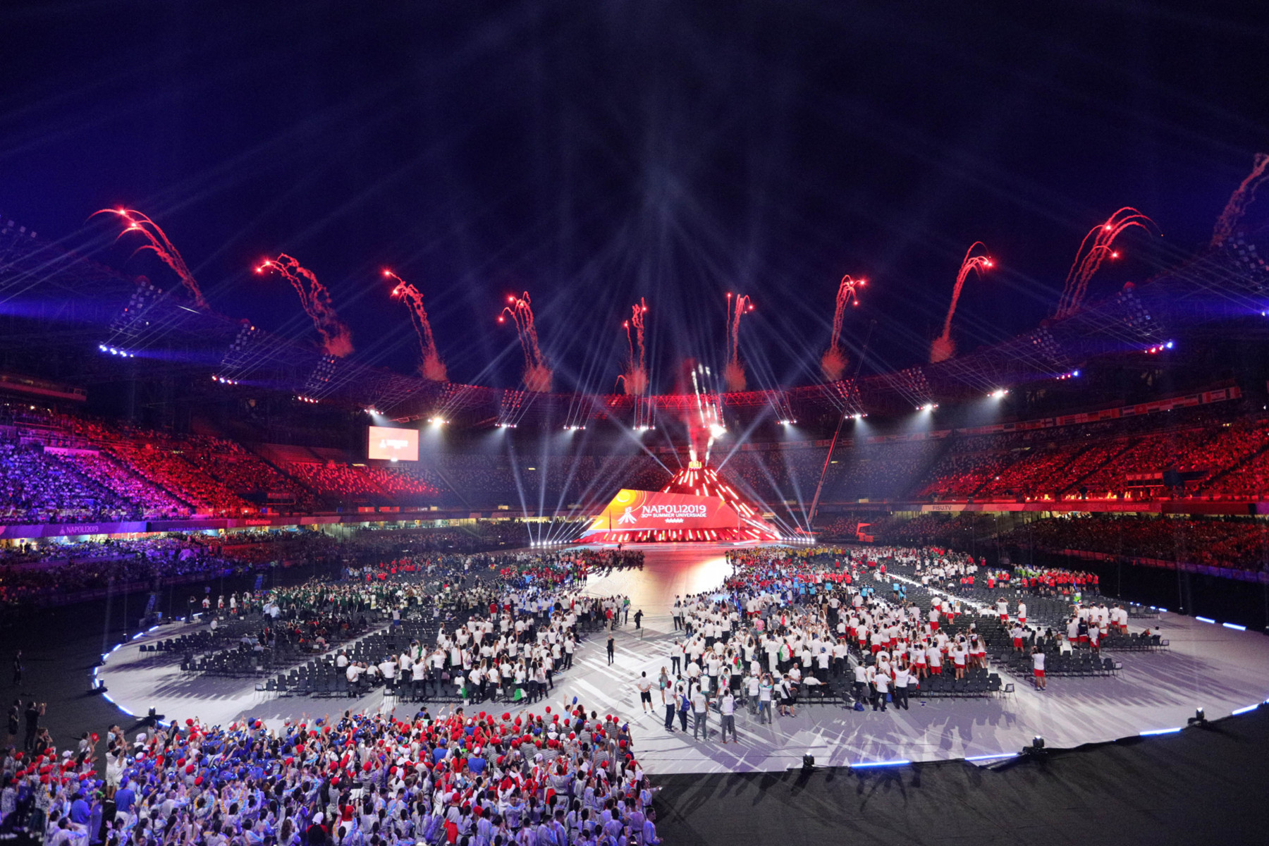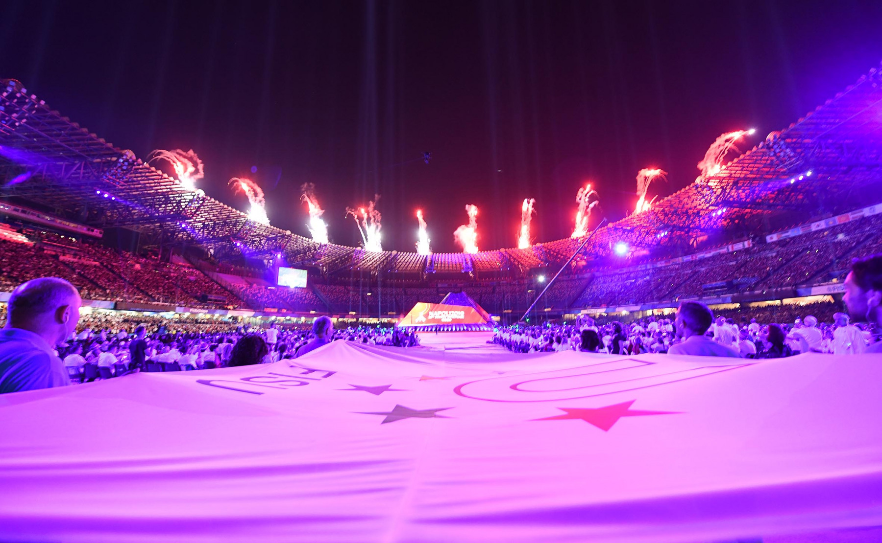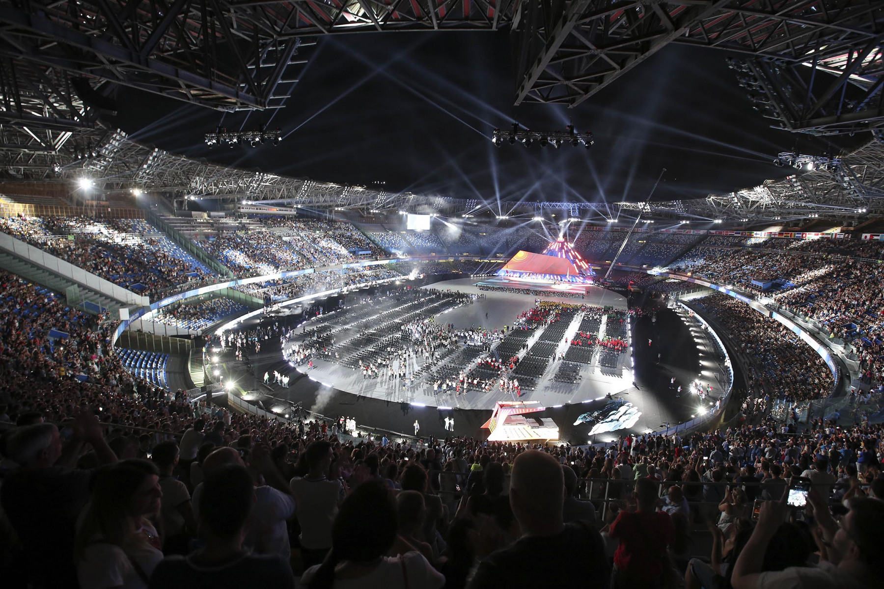 Uno show ricco di luci e suggestioni: dalla U del logo delle Universiadi, come concetto di unione, universalità e unicità, che si è accesa rappresentando due enormi braccia protese, al video countdown con i numeri della smorfia napoletana, fino al momento magico con l’ingresso di una sirena aerea, la sirena Partenope, interpretata dall’apneista partenopea Mariafelicia Carraturo. Partenope è avanzata con una coda argentata lunga 60 metri nello stadio che grazie a uno spettacolare gioco di luci ed effetti speciali, si è trasformata nel Golfo di Napoli, con il mare che ha invaso il terreno di gioco.