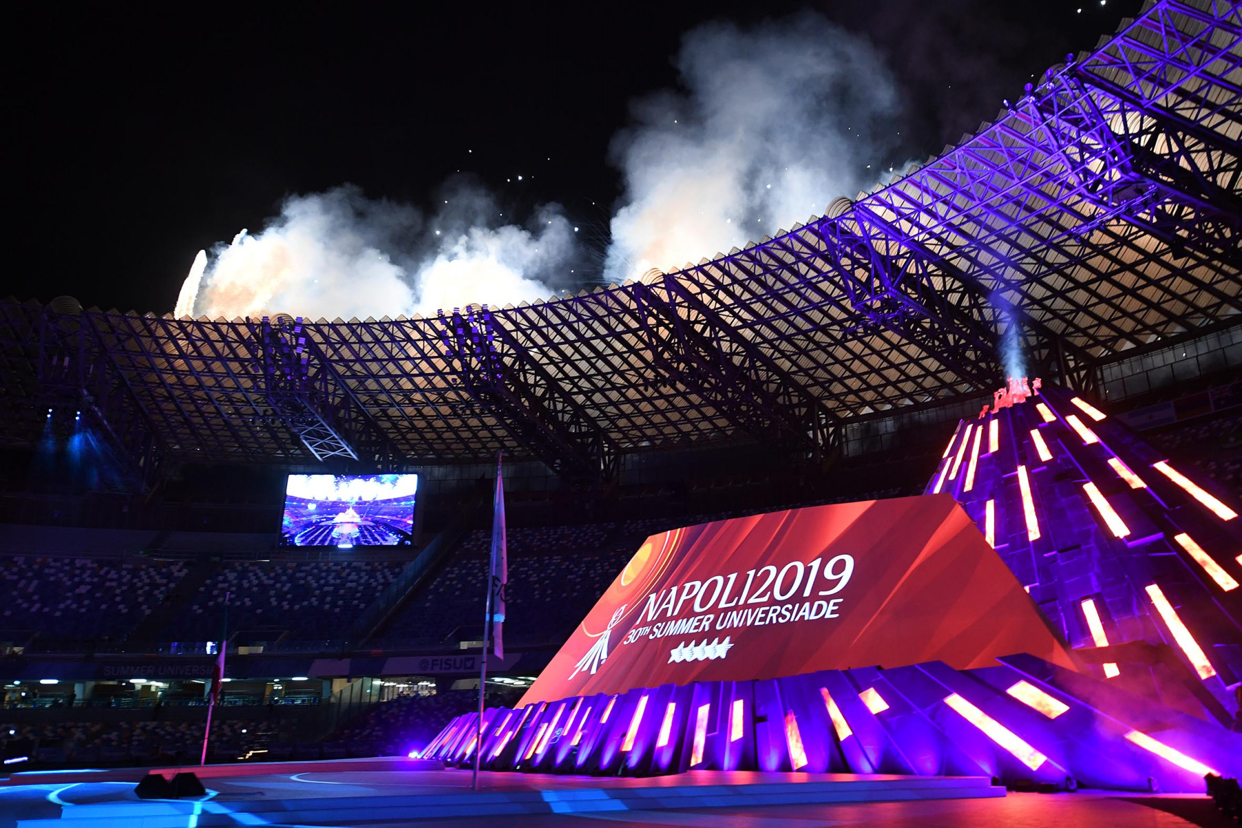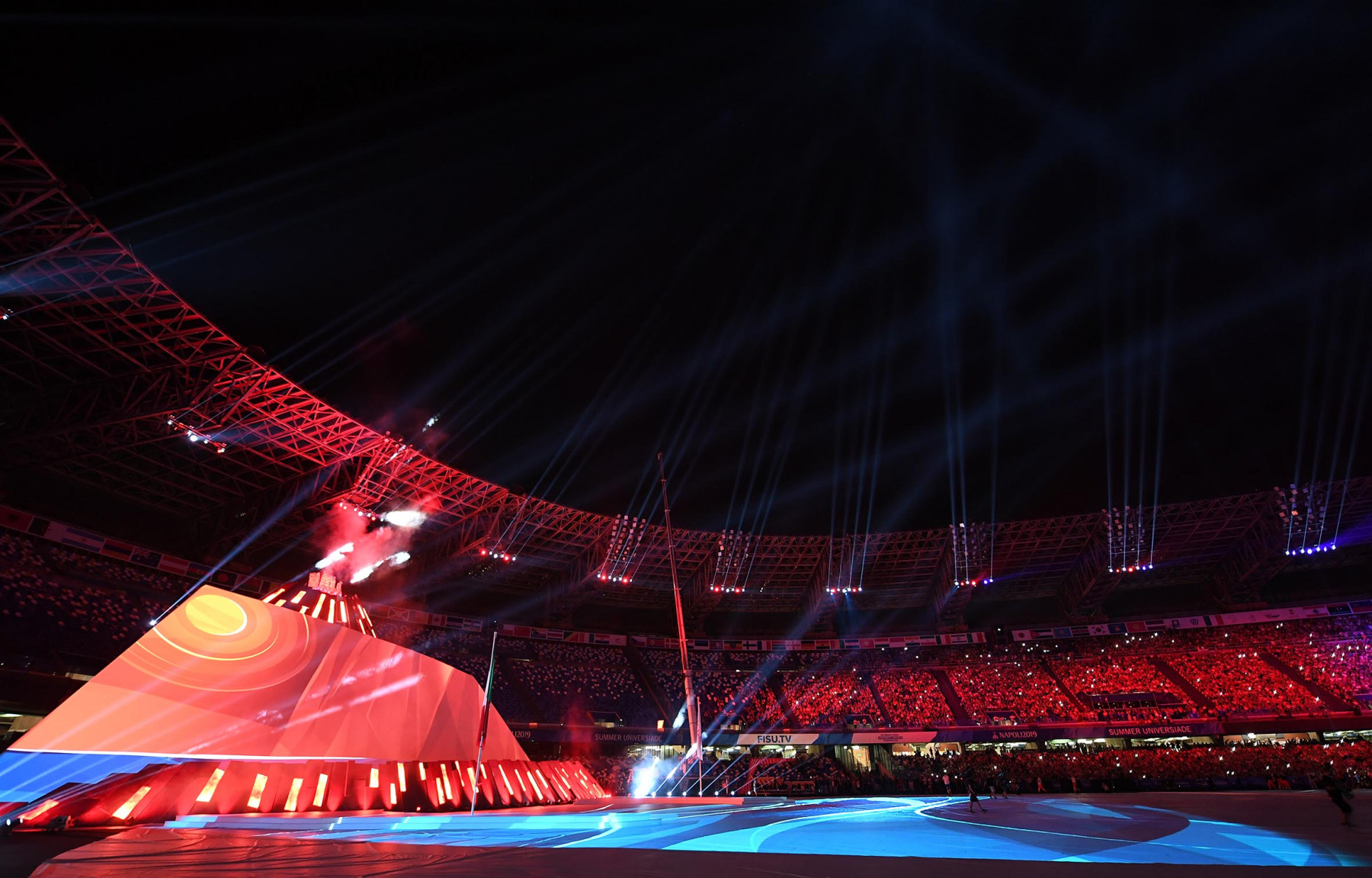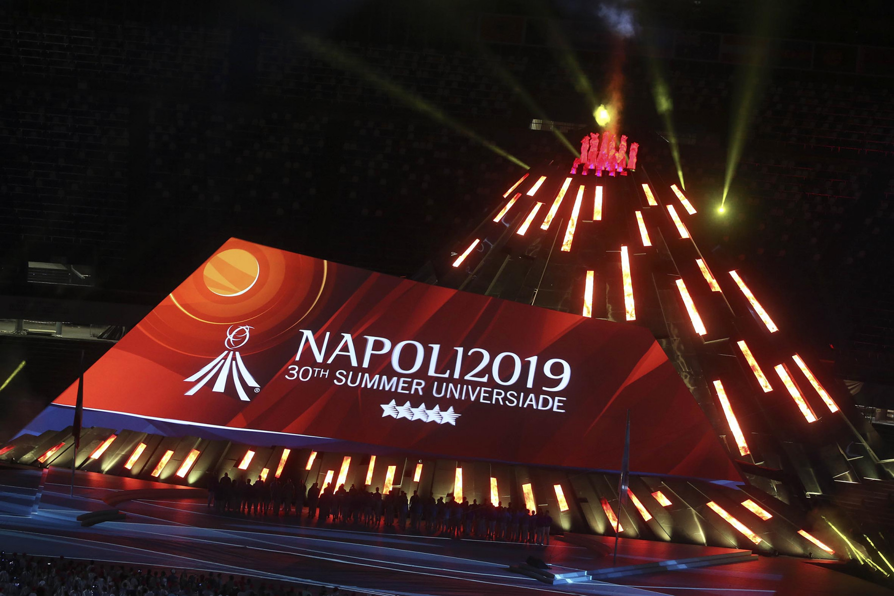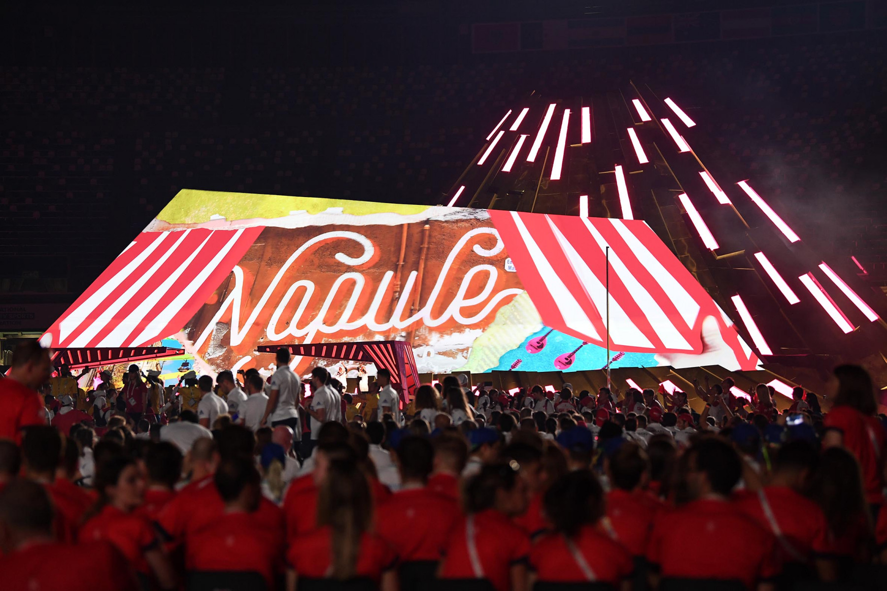 Uno show ricco di luci e suggestioni: dalla U del logo delle Universiadi, come concetto di unione, universalità e unicità, che si è accesa rappresentando due enormi braccia protese, al video countdown con i numeri della smorfia napoletana, fino al momento magico con l’ingresso di una sirena aerea, la sirena Partenope, interpretata dall’apneista partenopea Mariafelicia Carraturo. Partenope è avanzata con una coda argentata lunga 60 metri nello stadio che grazie a uno spettacolare gioco di luci ed effetti speciali, si è trasformata nel Golfo di Napoli, con il mare che ha invaso il terreno di gioco.
