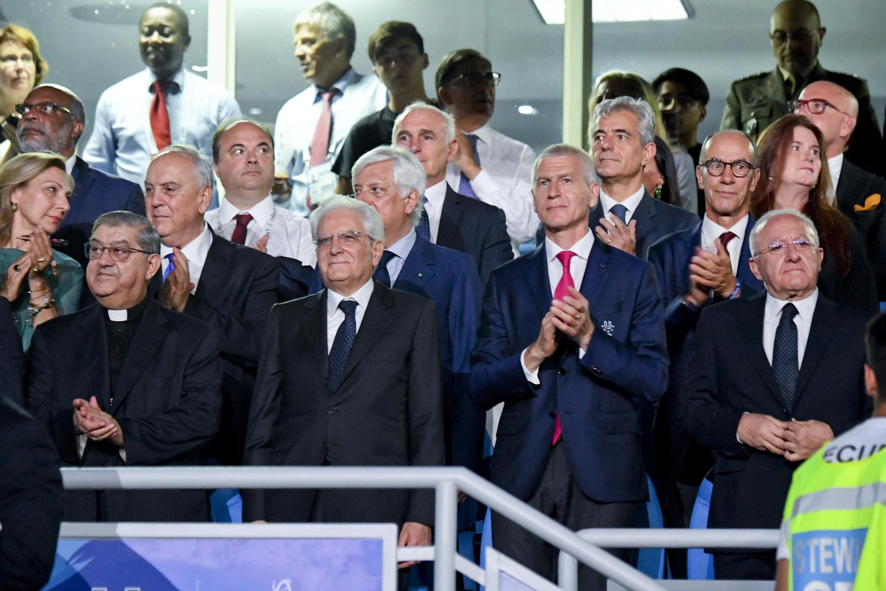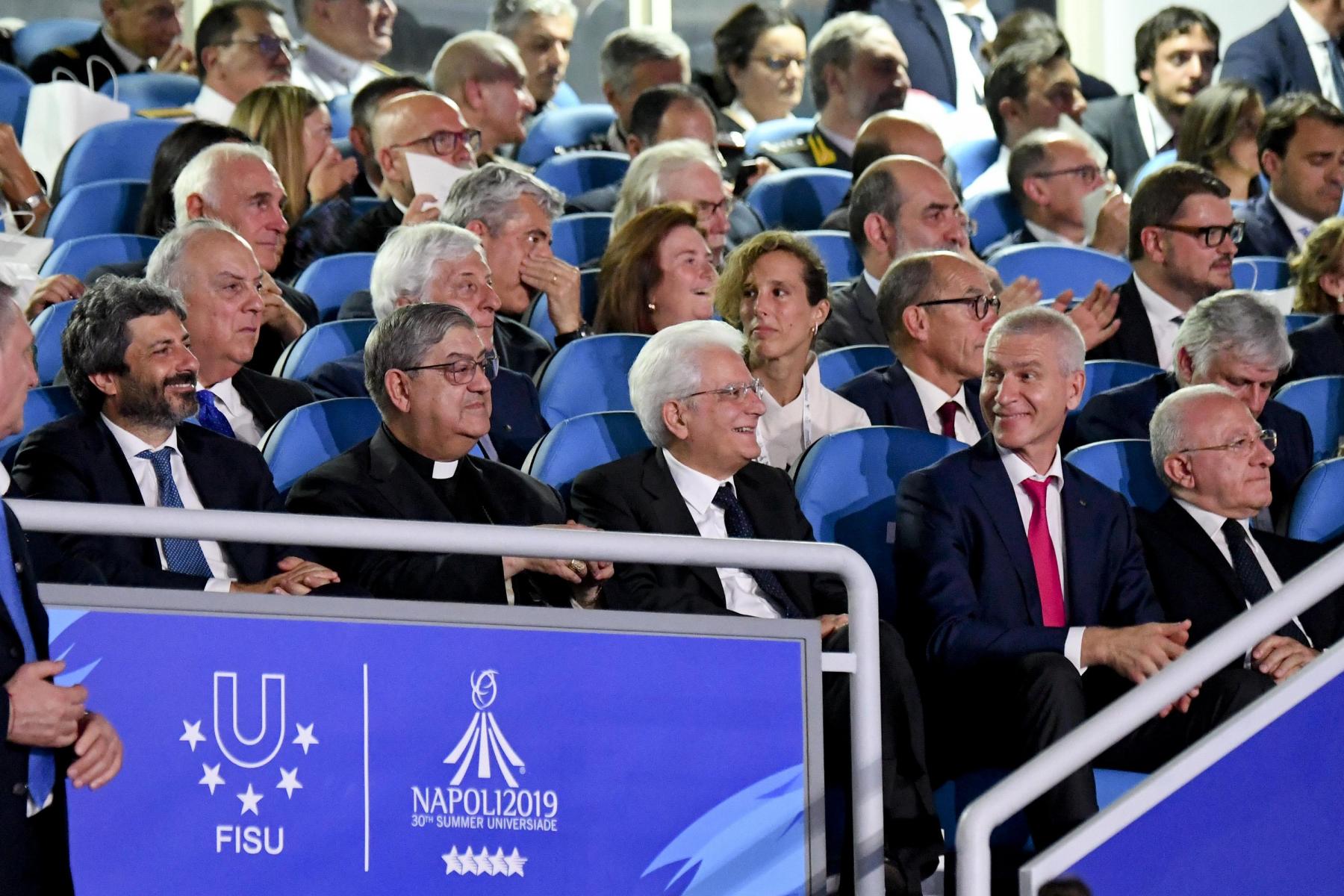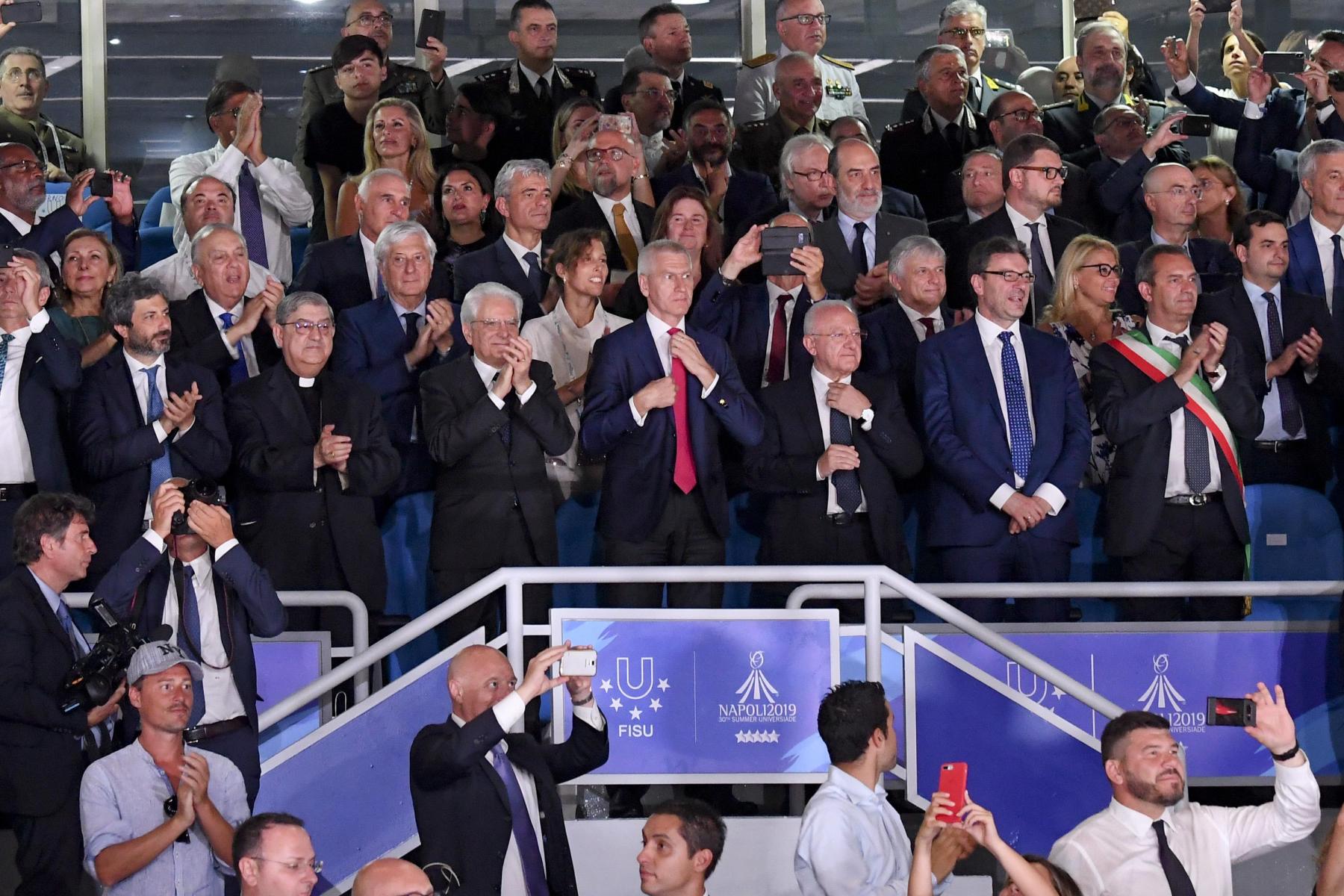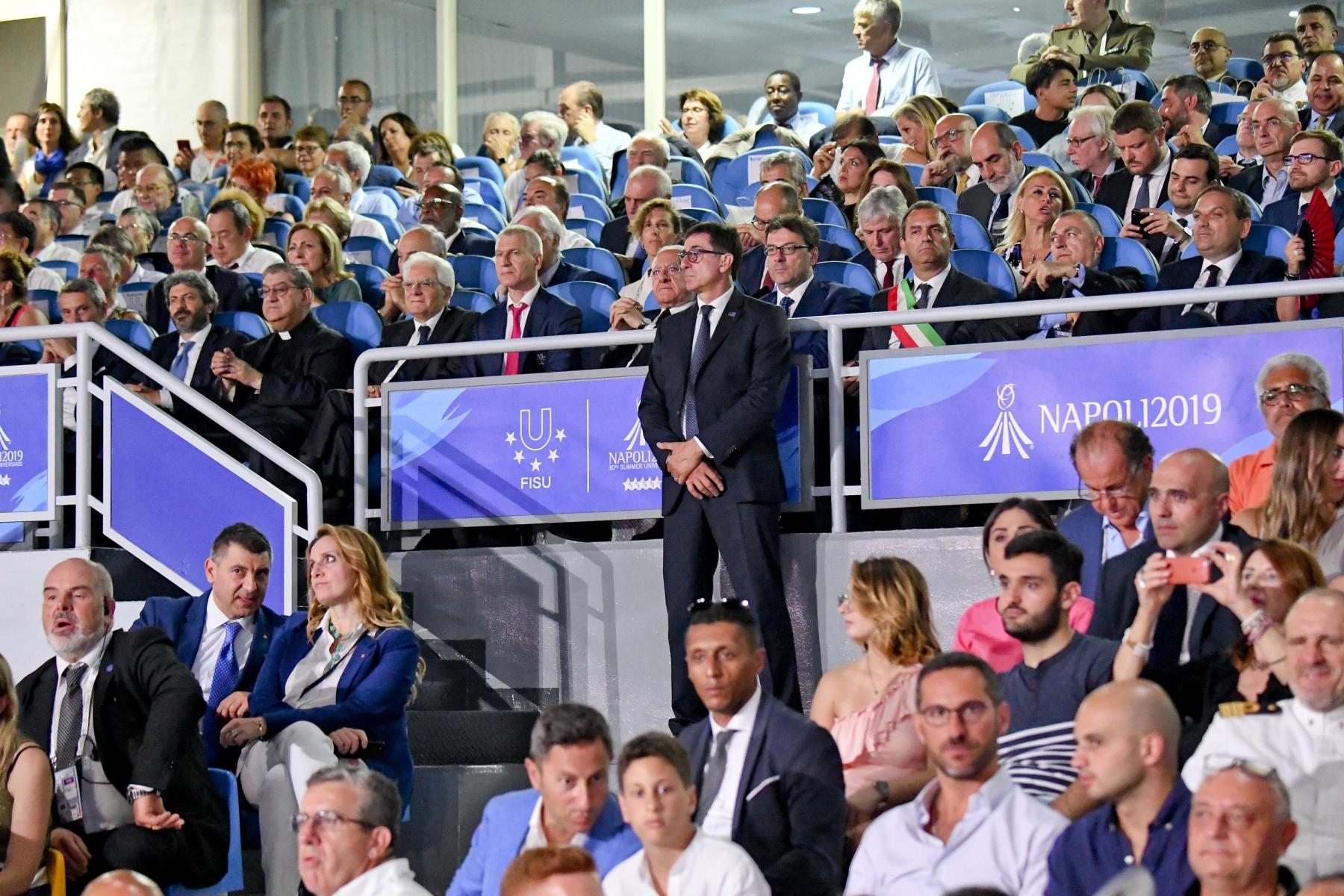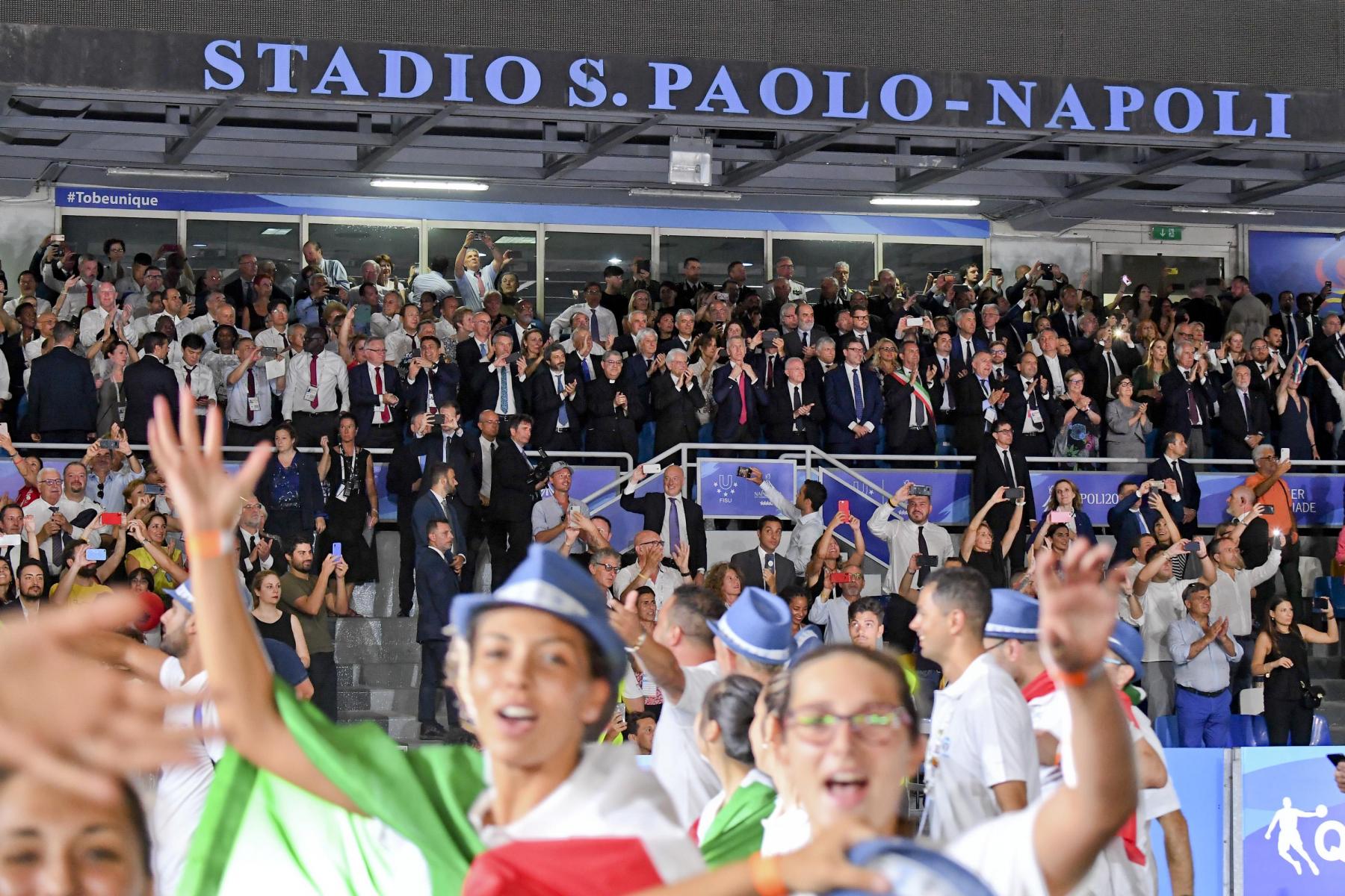 Pubblico delle grandi occasioni e tribuna autorità gremita di istituzioni per la cerimonia inaugurale della 30esima edizione delle Universiadi, in scena mercoledì 3 luglio alle ore 21 allo stadio San Paolo di Napoli. Oltre al Presidente della Repubblica, Sergio Mattarella, hanno assistito alla cerimonia: il presidente della Camera dei Deputati, Roberto Fico, i sottosegretari alla Presidenza del Consiglio Giancarlo Giorgetti, Simone Valente, Pina Castiello e Carlo Sibilia, il presidente del Coni Giovanni Malagò, il presidente della Regione Campania Vincenzo De Luca, il sindaco di Napoli Luigi de Magistris, l’arcivescovo di Napoli cardinale Crescenzio Sepe, il prefetto di Napoli Carmela Pagano, il procuratore nazionale antimafia Cafiero De Raho.