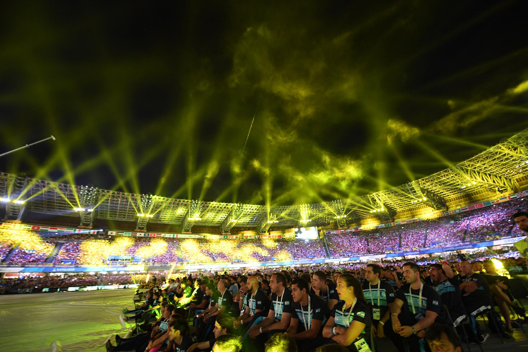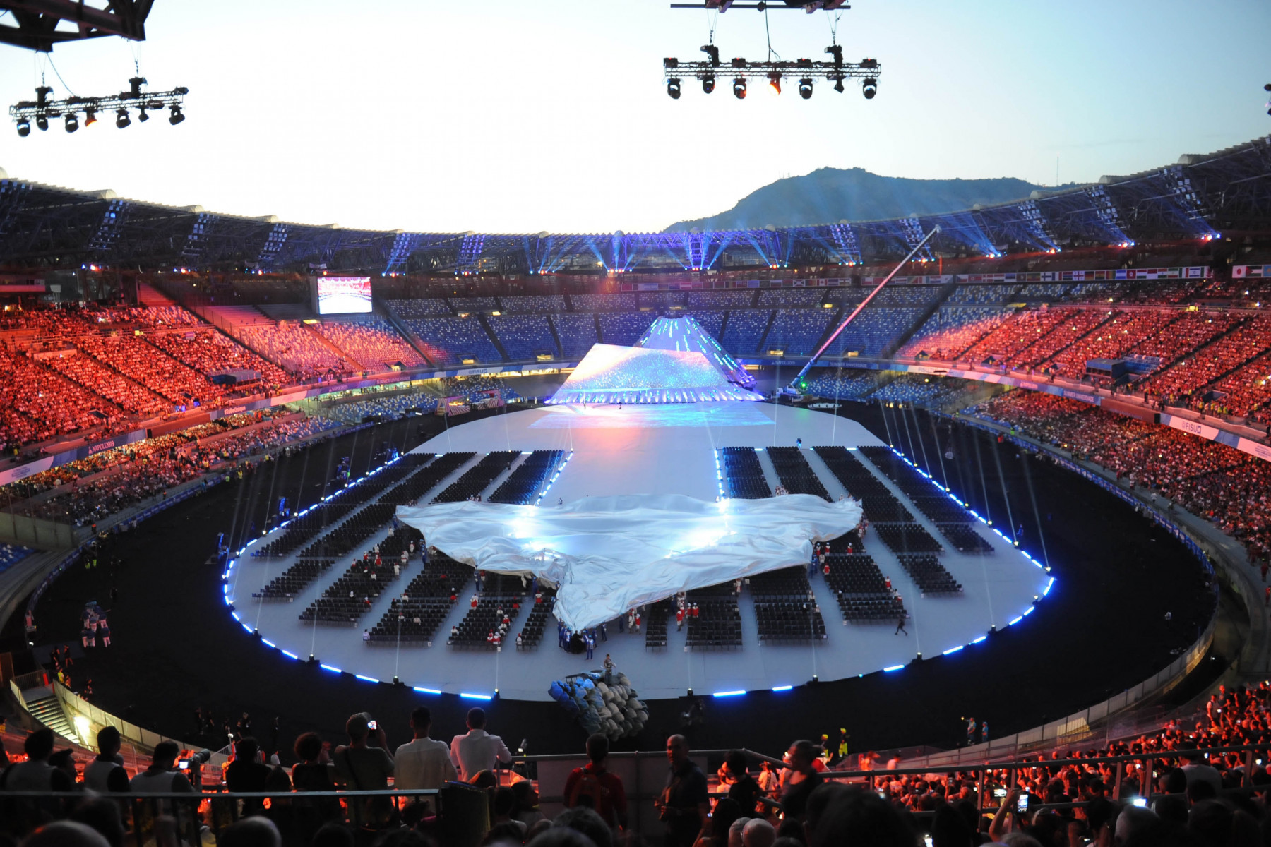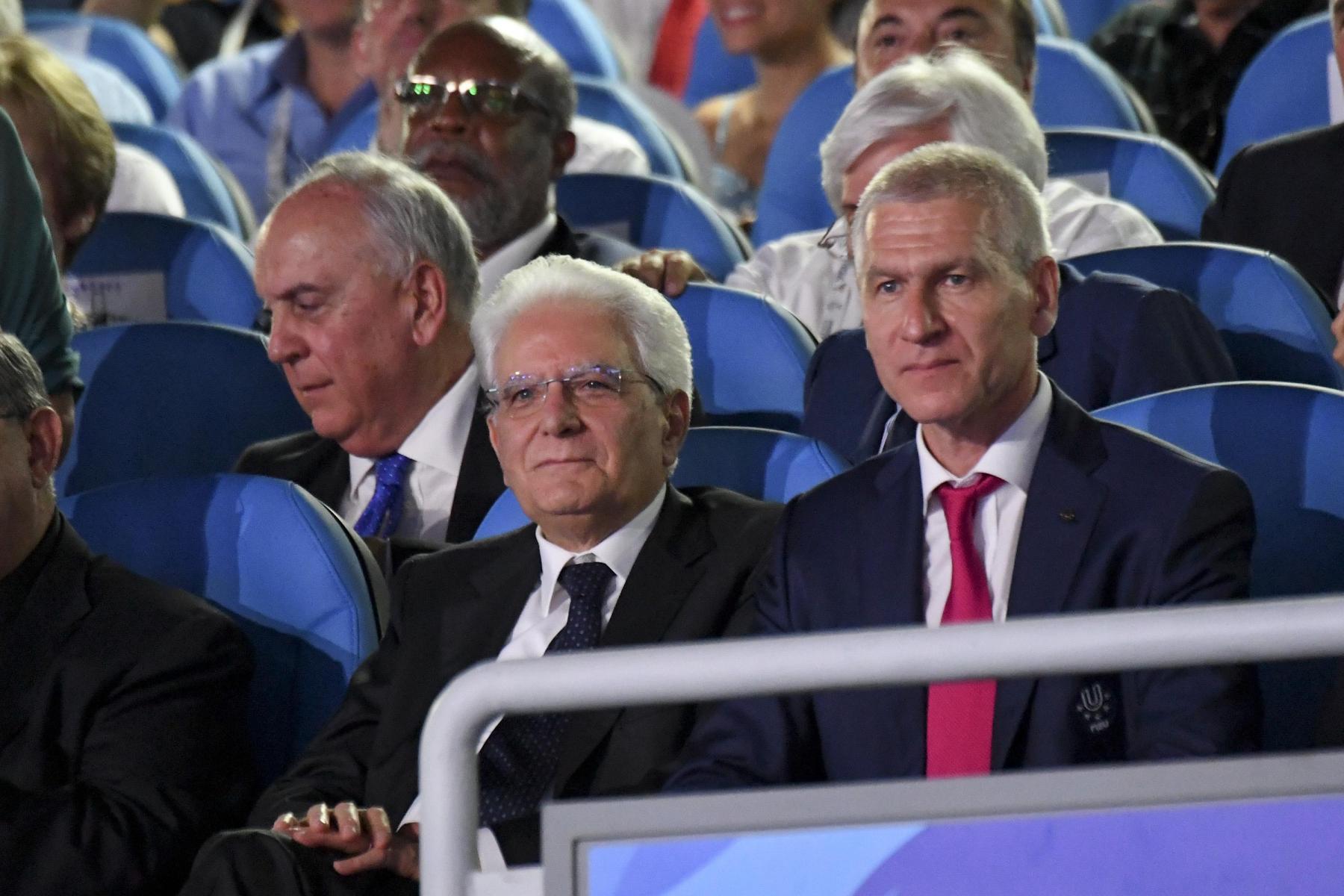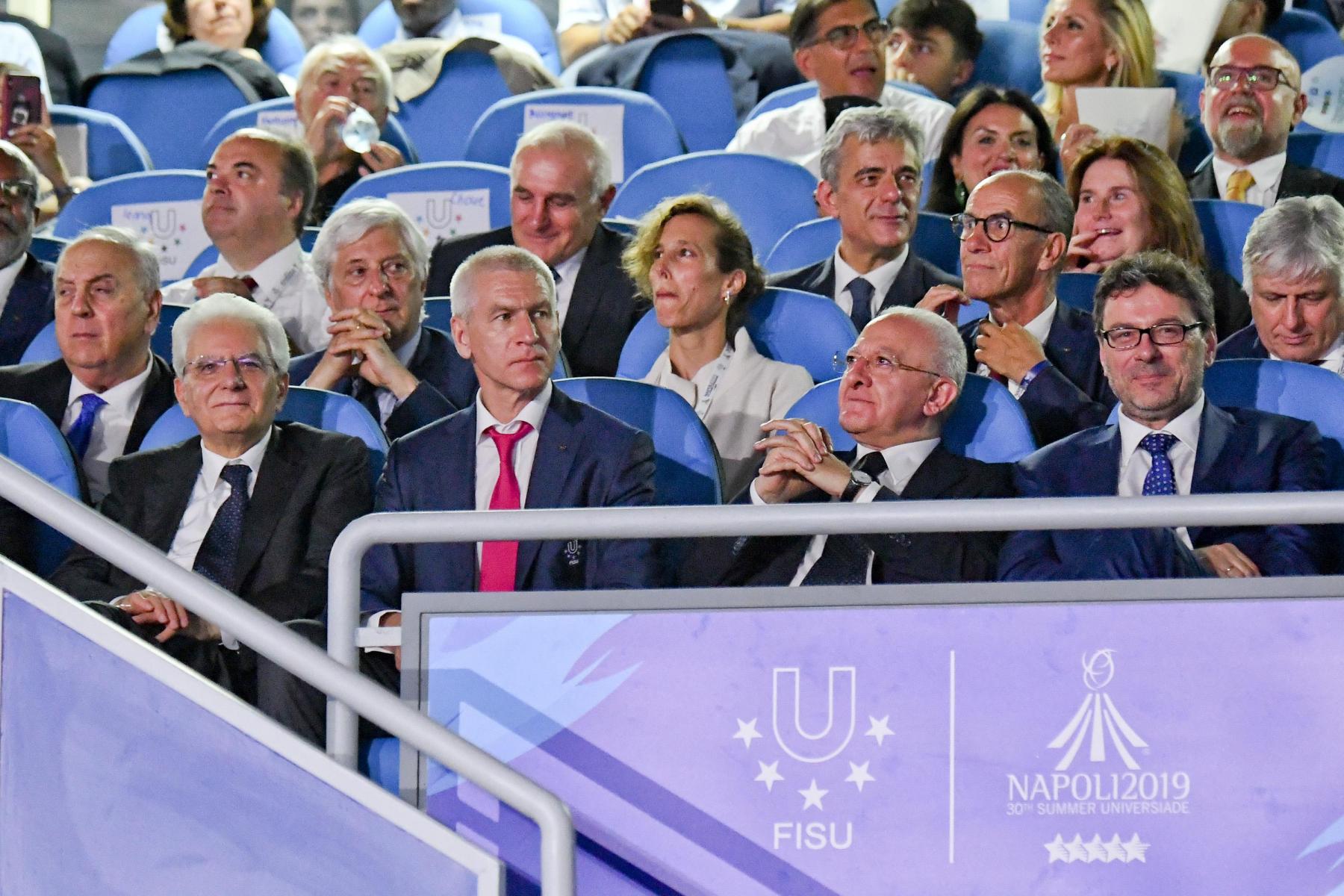 Pubblico delle grandi occasioni e tribuna autorità gremita di istituzioni per la cerimonia inaugurale della 30esima edizione delle Universiadi, in scena mercoledì 3 luglio alle ore 21 allo stadio San Paolo di Napoli. Oltre al Presidente della Repubblica, Sergio Mattarella, hanno assistito alla cerimonia: il presidente della Camera dei Deputati, Roberto Fico, i sottosegretari alla Presidenza del Consiglio Giancarlo Giorgetti, Simone Valente, Pina Castiello e Carlo Sibilia, il presidente del Coni Giovanni Malagò, il presidente della Regione Campania Vincenzo De Luca, il sindaco di Napoli Luigi de Magistris, l’arcivescovo di Napoli cardinale Crescenzio Sepe, il prefetto di Napoli Carmela Pagano, il procuratore nazionale antimafia Cafiero De Raho.