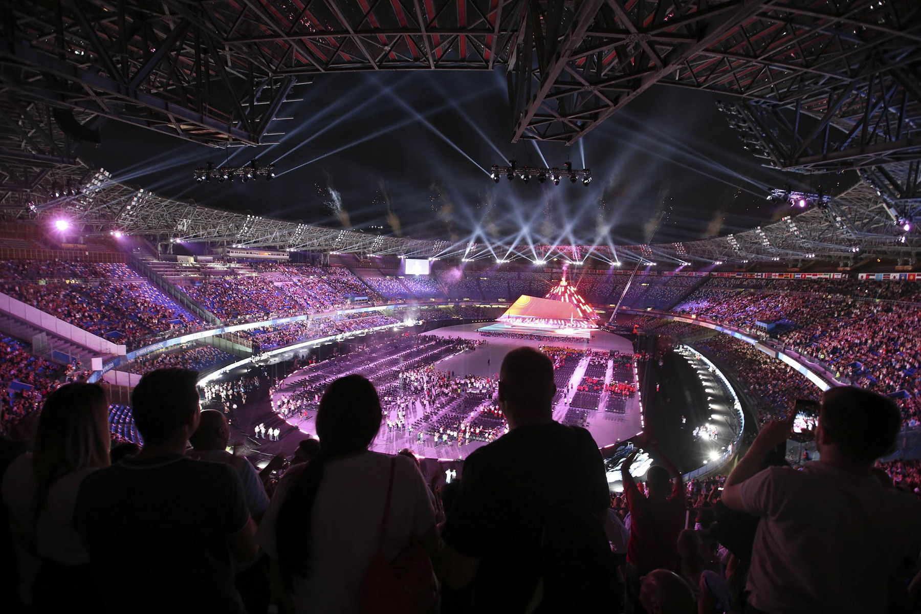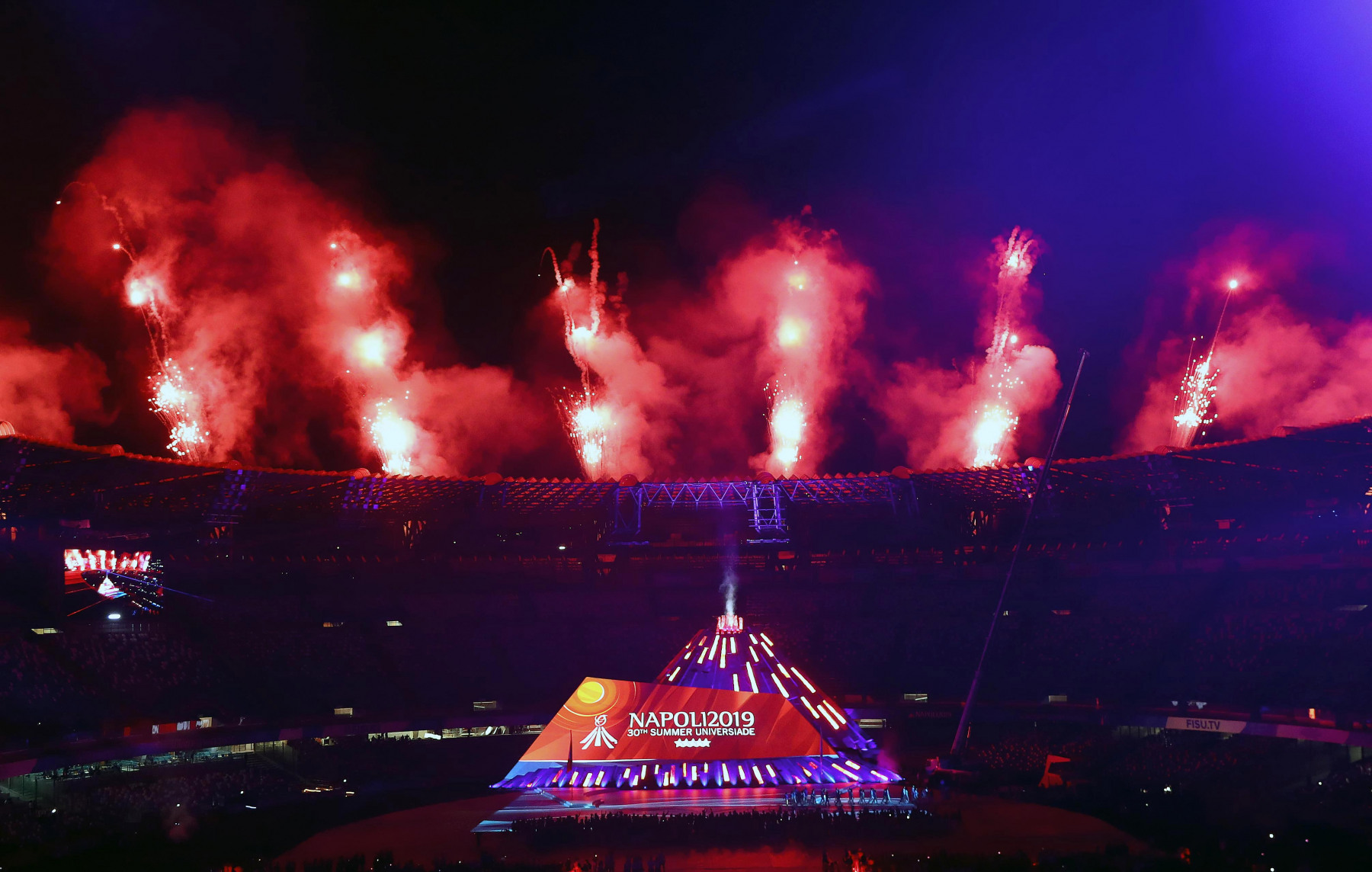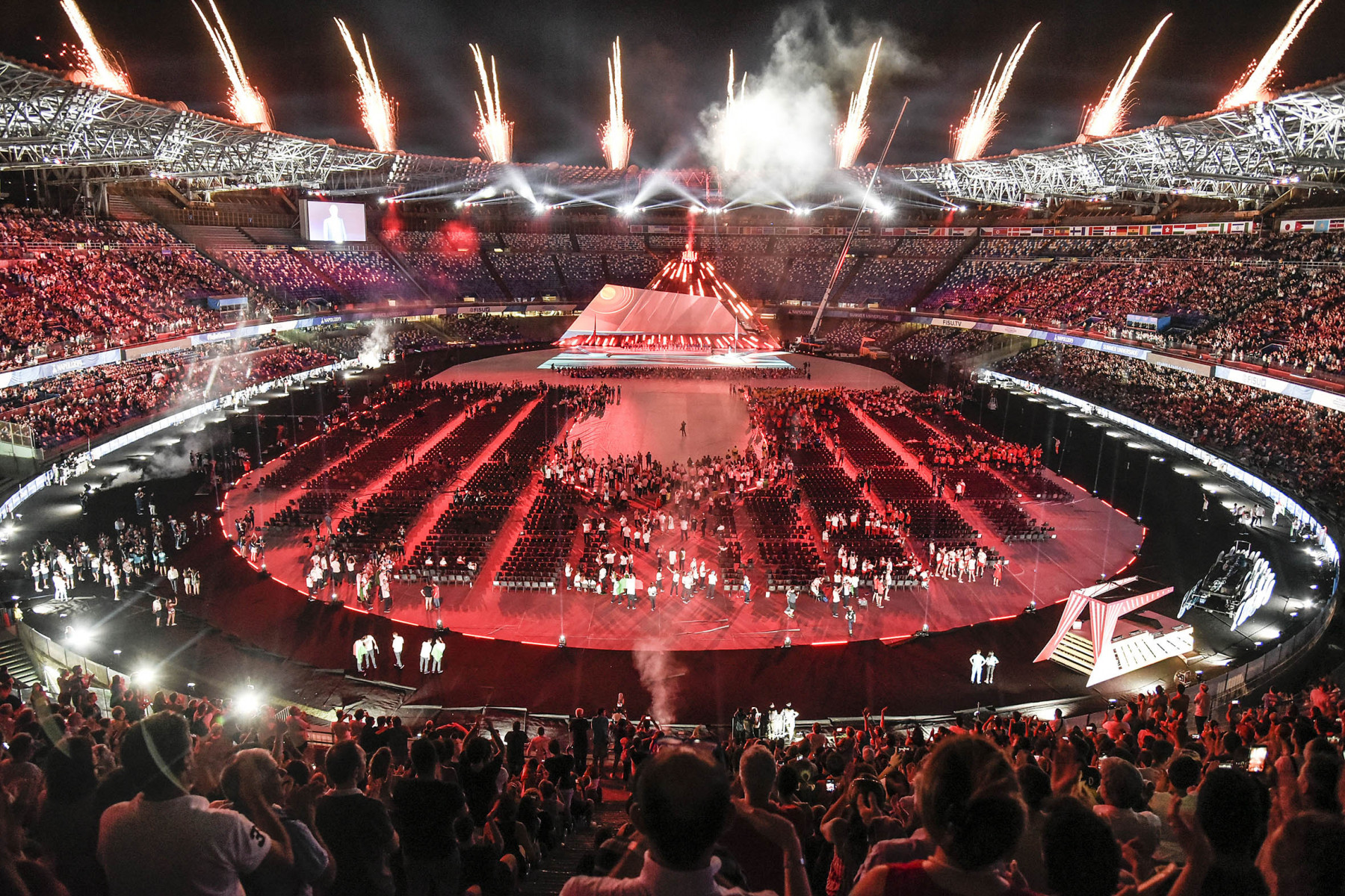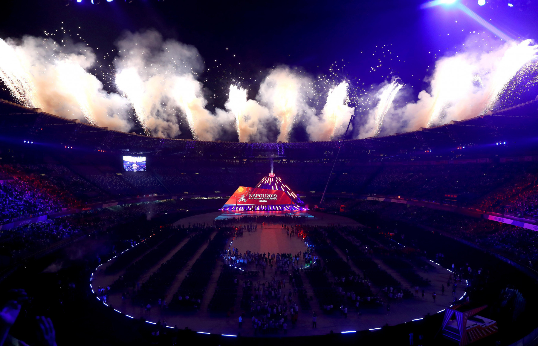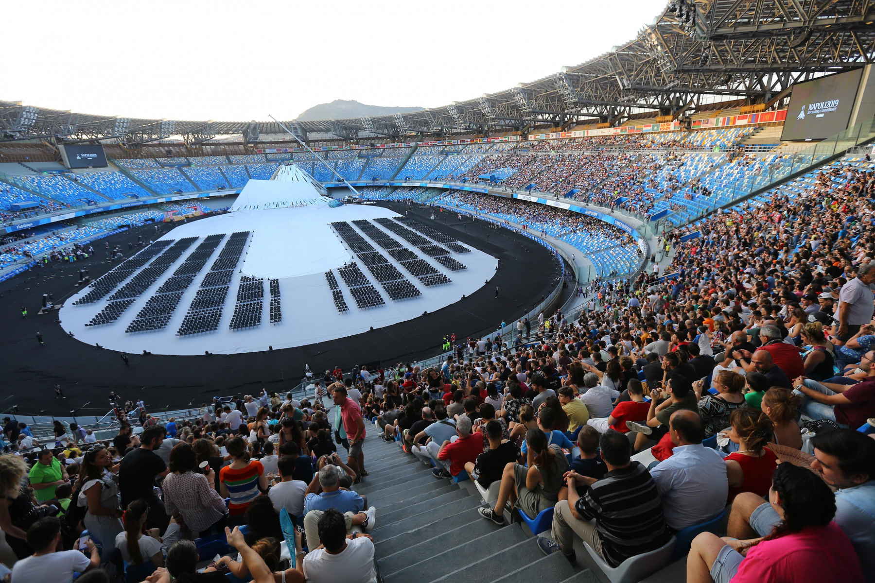Pubblico delle grandi occasioni e tribuna autorità gremita di istituzioni per la cerimonia inaugurale della 30esima edizione delle Universiadi, in scena mercoledì 3 luglio alle ore 21 allo stadio San Paolo di Napoli. Oltre al Presidente della Repubblica, Sergio Mattarella, hanno assistito alla cerimonia: il presidente della Camera dei Deputati, Roberto Fico, i sottosegretari alla Presidenza del Consiglio Giancarlo Giorgetti, Simone Valente, Pina Castiello e Carlo Sibilia, il presidente del Coni Giovanni Malagò, il presidente della Regione Campania Vincenzo De Luca, il sindaco di Napoli Luigi de Magistris, l’arcivescovo di Napoli cardinale Crescenzio Sepe, il prefetto di Napoli Carmela Pagano, il procuratore nazionale antimafia Cafiero De Raho.