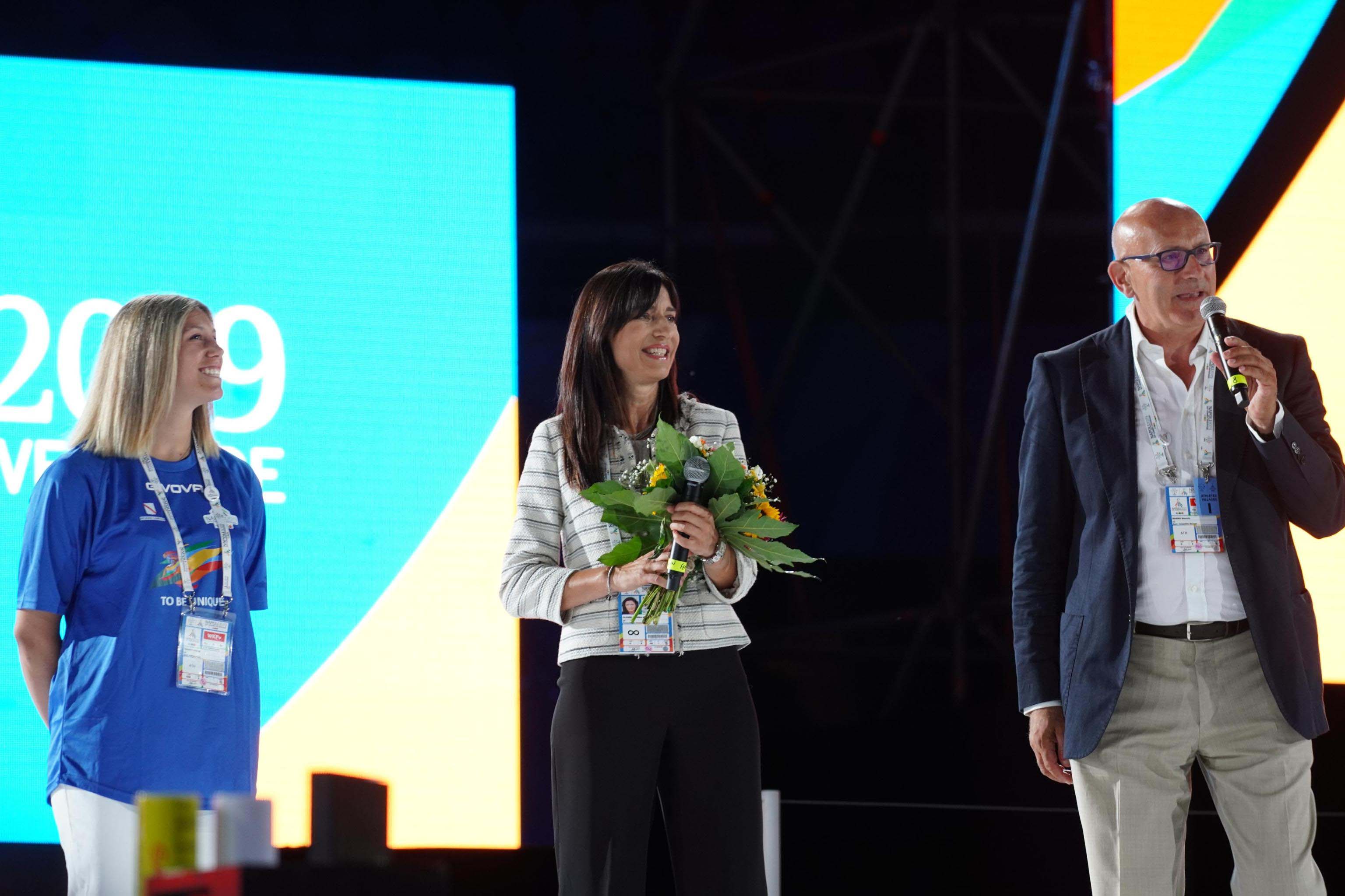 La moglie di Pietro Mennea Manuela Olivieri Mennea durante la cerimonia di chiusura delle Universiadi 2019 a Napoli,14 Luglio 2019.