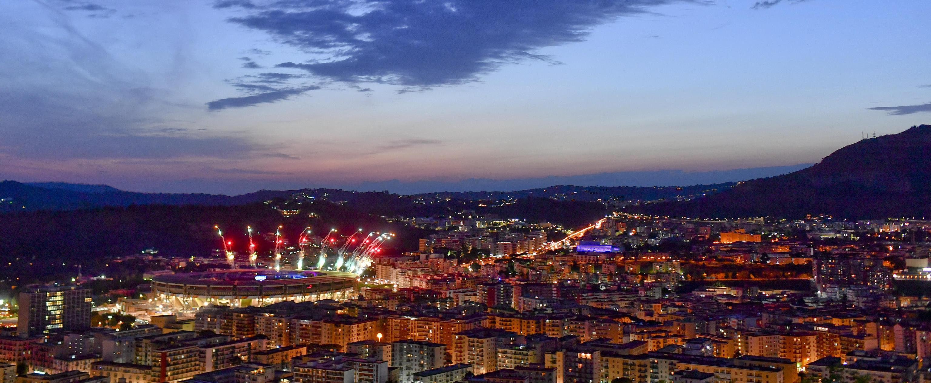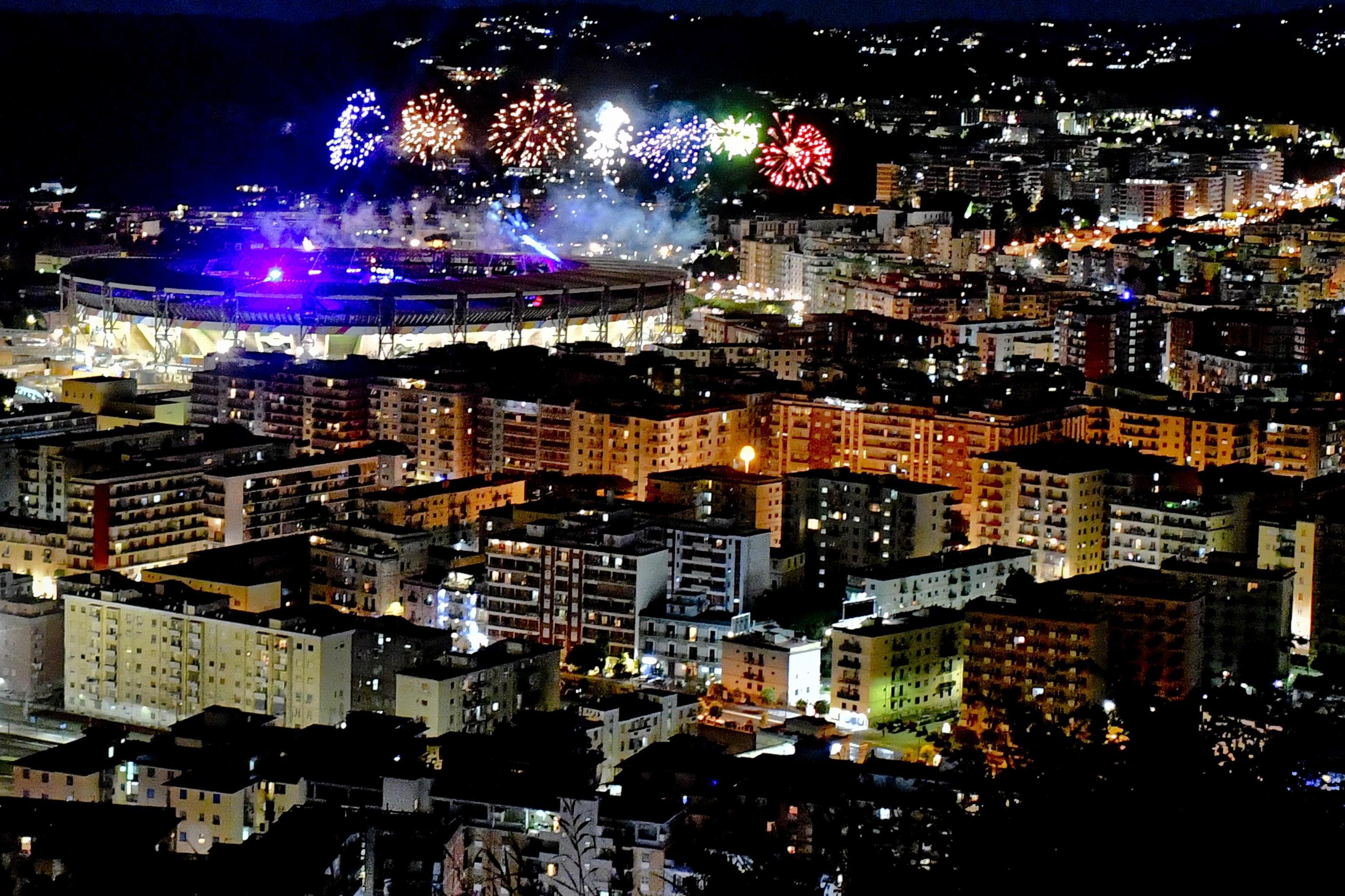 I giochi d’artificio allo stadio San Paolo visto dalla collina di Posillipo durante la cerimonia di chiusura dell’ Universiade Napoli 2019, a Napoli, 14 luglio 2019. ANSA/ CIRO FUSCO