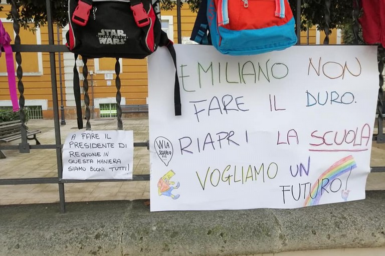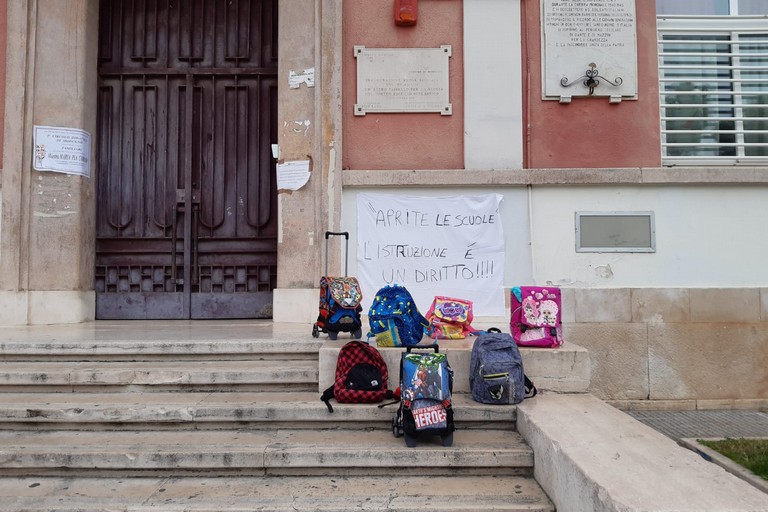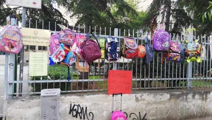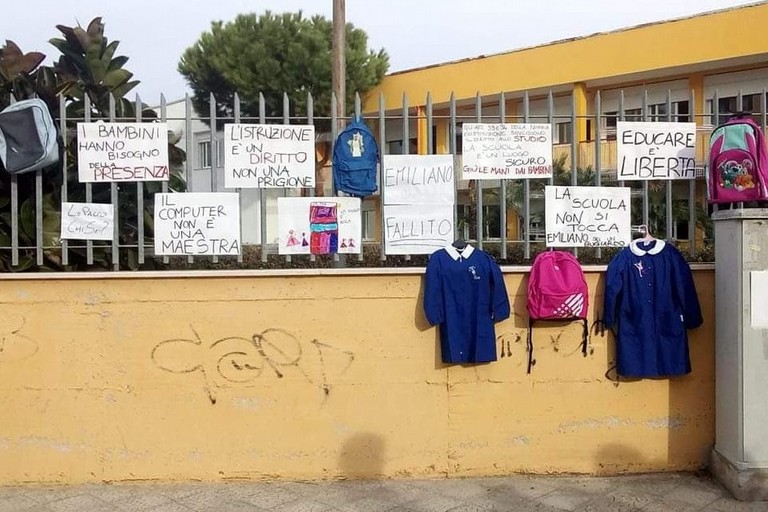 Zaini, cartelli e grembiuli appesi ai cancelli delle scuole in forma di protesta contro la decisione di adottare la didattica a distanza: una protesta alla quale hanno aderito tanti comuni e città italiane, dove mamme e bambini sono scesi in strada per palesare il loro dissenso in seguito alla decisione di introdurre la didattica a distanza.