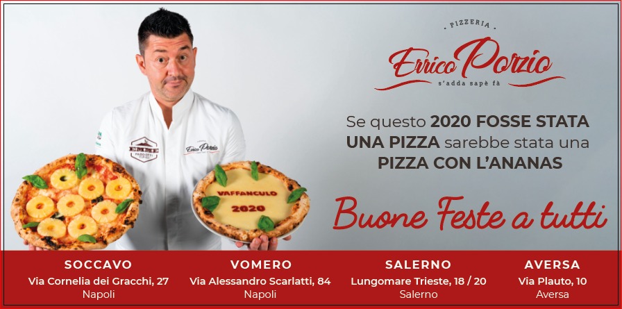 Un 2020 che il maestro pizzaiolo di Soccavo ha voluto salutare alla sua maniera, regalando l’ultimo genuino sorriso ai napoletani: “Se questo 2020 fosse stata una pizza, sarebbe stata una pizza con l’ananas”. Recita così il manifesto apparso a Napoli e che ritrae il maestro pizzaiolo Errico Porzio in compagnia di due pizze: una, per l’appunto, condita con l’ananas, sull’altra invece il pizzaiolo di Soccavo ha scalfito un colorito saluto all’anno che sta volgendo al termine.