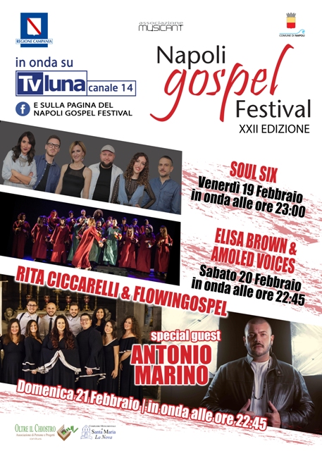 La 22.ma edizione del Napoli Gospel Festival si svolgerà dunque nel Complesso Monumentale di Santa Maria La Nova ed i singoli concerti saranno trasmessi su TV Luna (canale 14 digitale terrestre), seguendo questo programma: