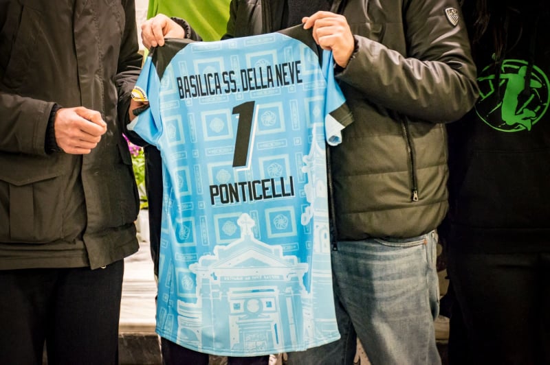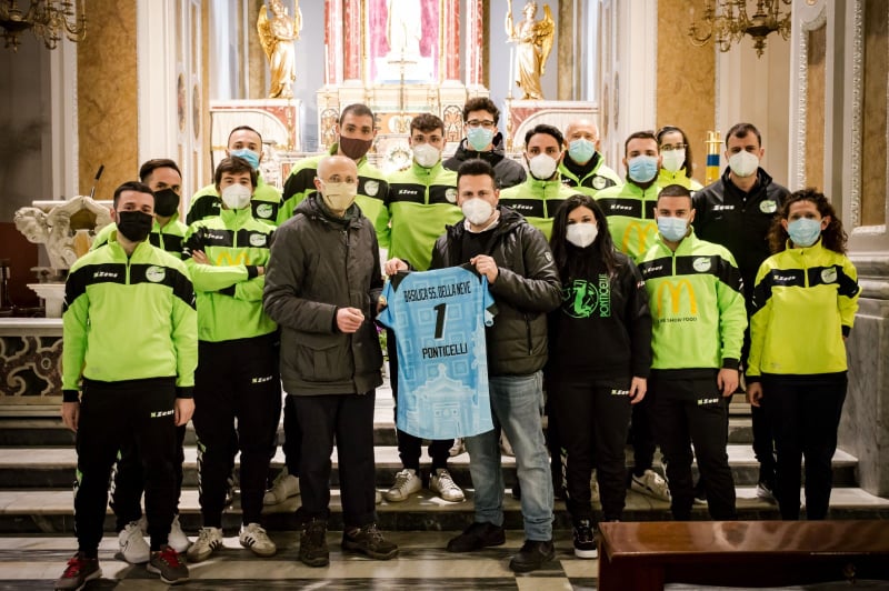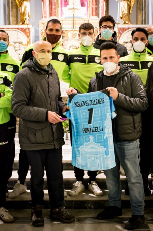 Questo luogo di culto, dedicato alla Madonna della Neve, che dal 1788 è stata proclamata Protettrice di Ponticelli, è un importante punto di riferimento per tutto il quartiere della periferia orientale di Napoli, un luogo difficile e con scarso accesso ai servizi. Oltre alle attività classiche (celebrazioni, catechesi, incontri dei ministranti, appuntamenti del gruppo giovani), presso questo luogo di culto vengono abitualmente svolte attività di sostegno per le persone bisognose (distribuzione abiti usati, raccolta alimentare, punto di ascolto parrocchiale e somministrazione dei pasti), attività che sono state intensificate negli ultimi tempi in quanto il numero delle persone disagiate è purtroppo aumentato a causa della crisi legata alla pandemia. Ed è proprio per premiare questo impegno che la “Pallavolo Ponticelli” ha creato le maglie per il settore maschile con una trama i cui elementi rimandano alle opere d’arte presenti sulla volta della Basilica e ai simboli della Festa della Madonna della Neve, che ogni anno si tiene a inizio agosto e che quest’anno non si è svolta in ottemperanza alle regole anti – Covid19. “Per noi e per tutti i ponticellesi questo luogo è da sempre un importante punto di riferimento, e lo è ancora di più negli ultimi tempi“, spiega Gerardo Amato, fondatore e Presidente della Nuova Polisportiva Ponticelli. “La squadra migliore è fatta di soggetti migliori. Siate uniti e coesi, lo spirito di squadra va coltivato 24 ore su 24, non solo in fase di competizione. Così facendo si ottengono tante soddisfazioni nello sport, e nella vita!“, con queste parole Don Marco Liardo ha ringraziato i componenti della squadra.