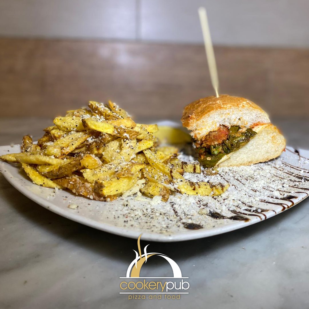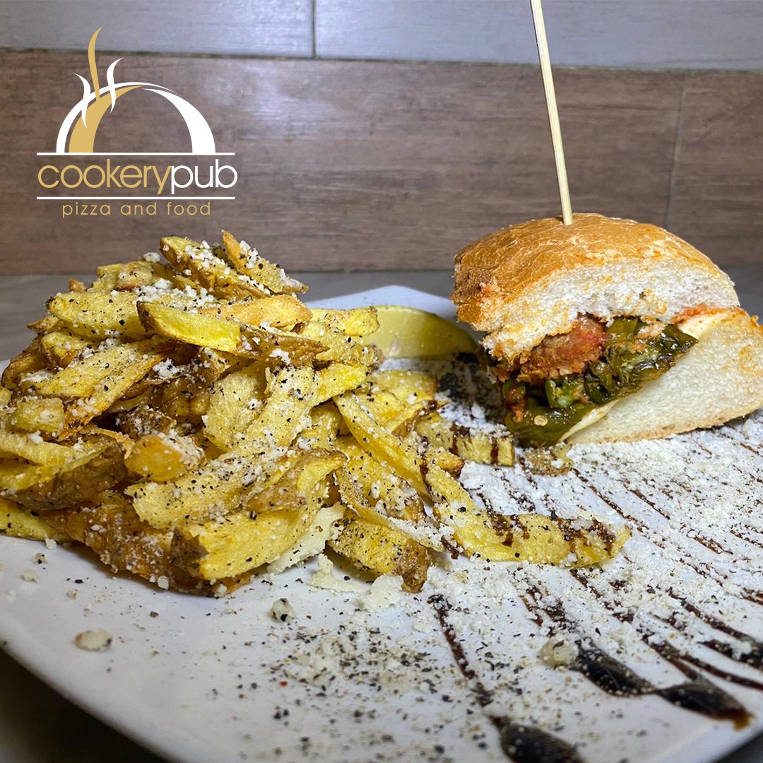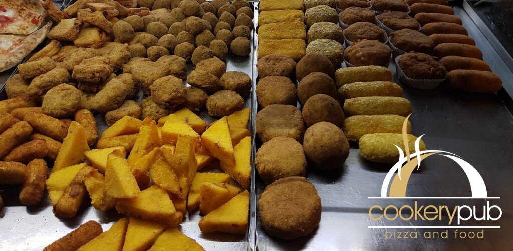 Chi opta per un take away rapido può scegliere direttamente dalla fornitissima vetrina del “Cookery pub” il cibo da portare via: tranci di pizze di tutti i tipi, ma anche panni, montanare, hot dog, focacce, e soprattutto l’irresistibile frittura di casa Cookery che vanta un imbattibile rapporto qualità/prezzo. Rigorosamente homemade, dal crocchè di patate alla frittatina di pasta, passando per le arancine, la polenta fritta, le immancabili zeppole e il pane in carrozza, disponibile sia in formato “small” che “large”, la frittura di Cookery gode di una fama consolidata negli anni ed è uno dei cavalli di battaglia da assaggiare assolutamente, almeno una volta nella vita. Al pari della pizza salsiccia e friarielli che costringe i palati fini dei comuni limitrofi a tornare e ritornare in quella sede, pur gustarla, ancora una volta.