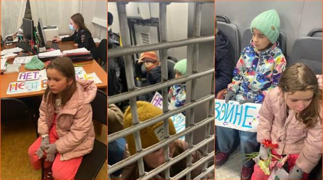 Le fotografie dei bambini in una stazione di polizia sono state condivise su Twitter e Facebook da Ilya Yashin, membro dell’opposizione russa a Vladimir Putin; le immagini mostrano i piccoli prima seduti in un van della polizia poi in un ufficio. La loro colpa, insieme alle mamme, sarebbe quella di aver deposto dei fiori davanti all’ambasciata ucraina, mostrando in questo modo solidarietà verso il “nemico”. Non solo: i bimbi tenevano in mano cartelli con scritto “Stop alla guerra” e “Russia + Ucraina = amore”, messaggi evidentemente non graditi al regime di Putin.
