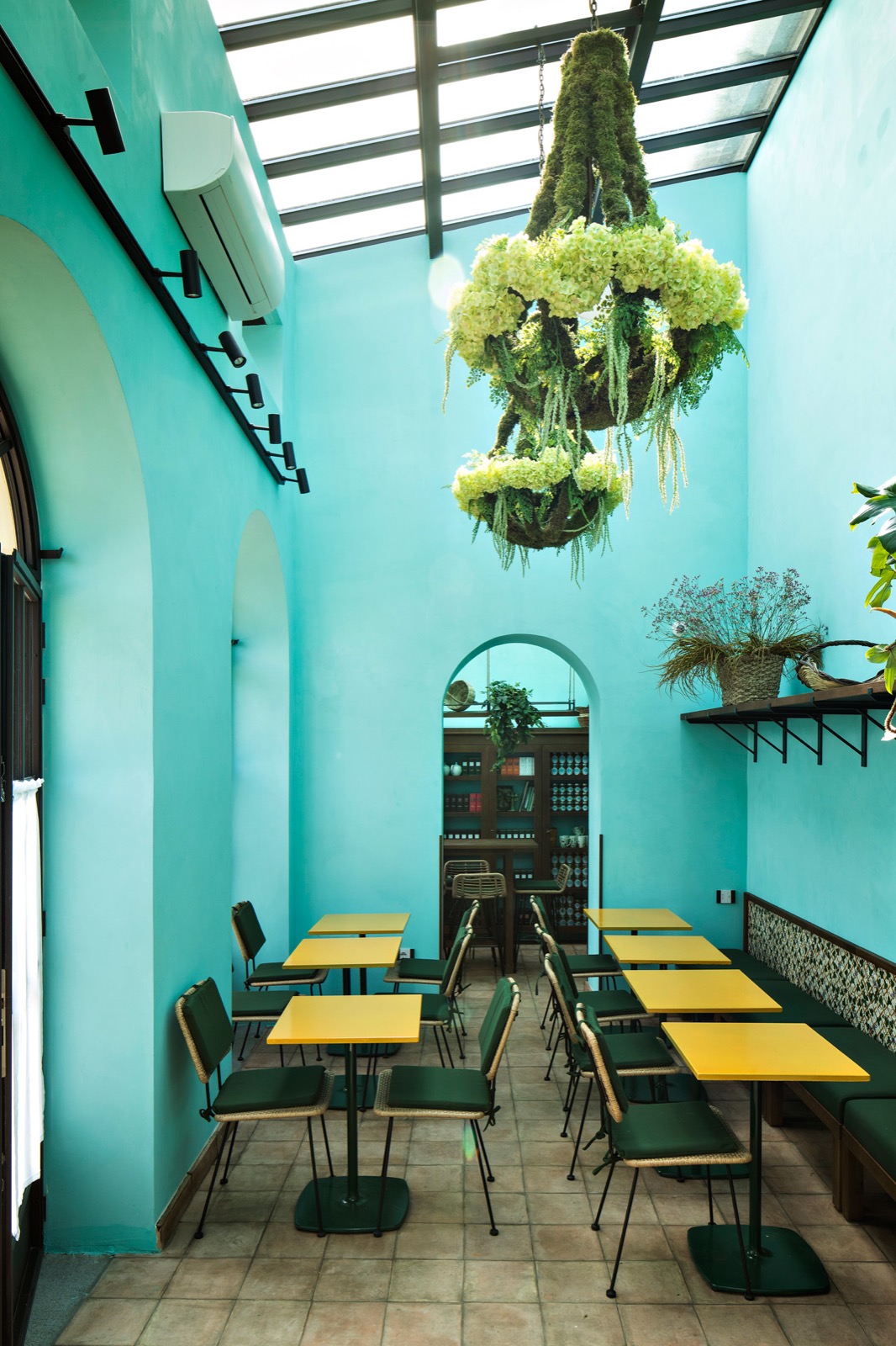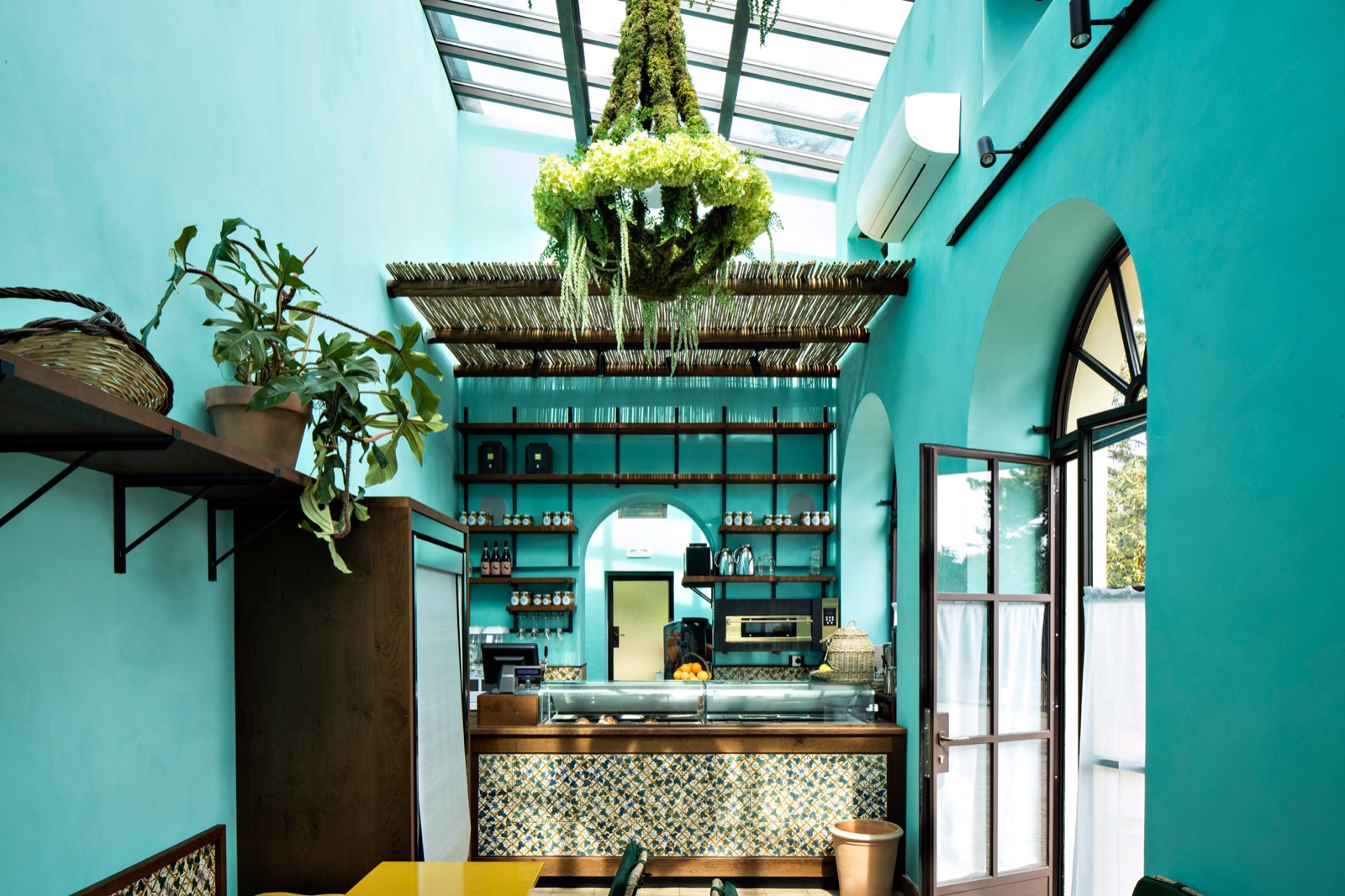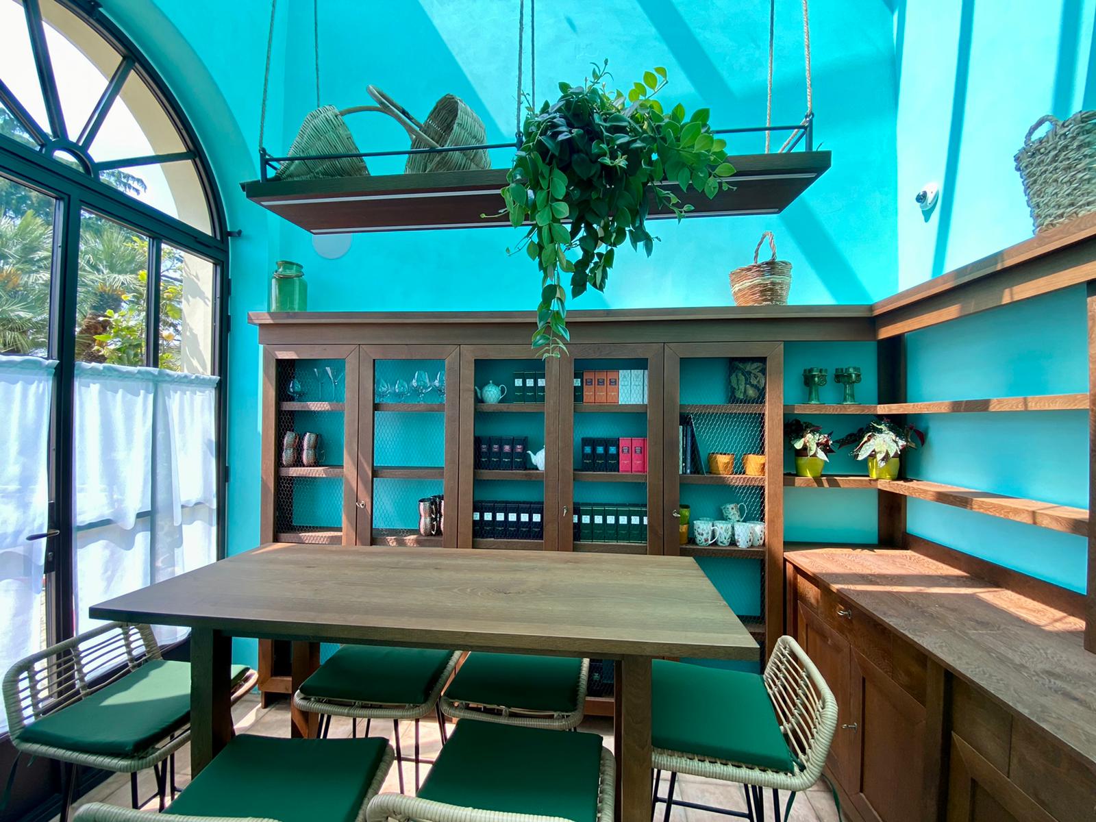 Con attenzione agli aspetti storico-filologici e l’impiego delle più moderne tecnologie, è stato possibile riproporre per gli interni la coloritura “Vetriolo di Cipro”. La tonalità di azzurro intenso risaliva probabilmente ad interventi di restauro precedenti, ed era stata scelta per le proprietà fungicida del Vetriolo di Cipro, solfato di rame, particolarmente funzionali in ambienti con elevato tasso di umidità come le serre. Il colore attuale è stato ottenuto con lo spatolato su intonaco bianco, una particolare tecnica pittorica che rende la superficie della parete lucida e liscia ma soprattutto ricca di velature, permettendo così di poter ricreare sfumature di colori perfettamente corrispondenti alle antiche velature del vetriolo di rame impiegato in passato.