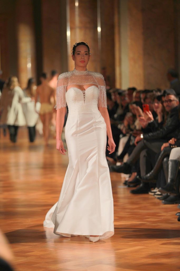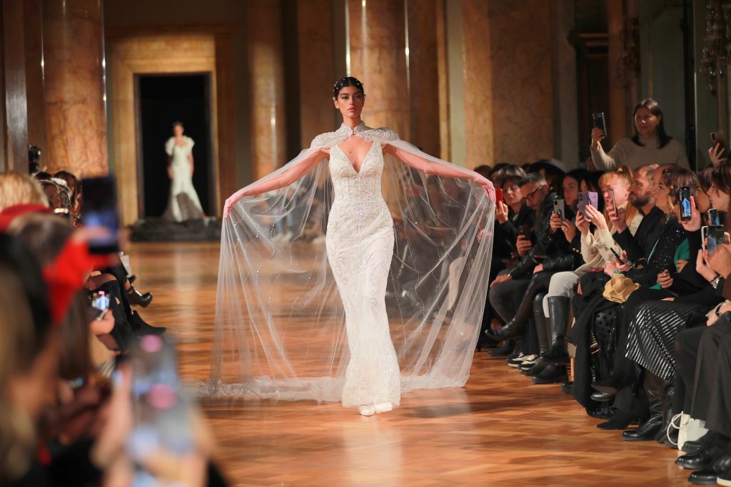 Oltre quattrocento ospiti sono accorsi alla sfilata di Gianni Molaro chetorna sulle passerelle romane dopo quasi dieci anni, ed è un ritorno in grande stile. Il celebre couturier campano, anche personaggio tv grazie alla nota trasmissione Detto Fatto in Rai, ha sceglie di presentare la sua alta moda sposa domenica 26 novembre 2023 nella settecentesca e maestosa Galleria del Cardinale Colonna. La residenza nobiliare dei Principi Colonna accoglie per la prima volta una sfilata dedicata interamente alla sposa grazie alla maestria delle lavorazioni a mano, 100% Made in Italy, della Maison Molaro. La collezione sposa 2024 di Gianni Molaro, presentata per l’occasione da Elena Parmegiani, Direttore Eventi della Galleria del Cardinale Colonna e Coffee House di Palazzo Colonna e giornalista di moda e costume, si caratterizza per i preziosi ricami a mano realizzati dalle petites mains locali. Cristalli, cannette e perle impreziosiscono gli scenografici abiti scultorei regalando alle spose una luce divina. Oltre ai ricami, ai pizzi di chantilly francese, molti abiti sono decorati con intagli e trasparenze. Le silhouette si caratterizzano per le linee a sirena morbide ed ampie che danno la possibilità ad ogni donna di scegliere l’abito più adatto alla propria fisicità. Le creazioni sono realizzate con tessuti in mikado, con fluidi cady e leggiadri chiffon. Non poteva mancare l’organza in seta, il tessuto che rende ogni abito romantico. La collezione sposa 2024 è arricchita da numerosi accessori, come i guanti ricamati o di pizzo, i manicotti a palloncino e i foulard in chiffon. Le scollature sono profonde o trasparenti, preziose o frastagliate, all’americana, omerali oppure a cuore. Ciò che ha sempre reso unico lo stilista Gianni Molaro sono gli abiti da sposa trasformabili. Da lungo a corto, da romantico a sirena, con maniche e décolleté staccabili etc. Creazioni che si trasformano al momento del taglio della torta per stupire i propri invitati e che proprio lo stilista in passerella mostrerà live al pubblico. Ha aperto l’evento una performance di danza e ha chiuso la sfilata/show un sontuoso abito da sposa di colore rosso. Una creazione di alta moda del 1999 della prima sfilata di Gianni Molaro a Roma che lo stilista ha rivisitato ed impreziosito. Un omaggio del designer alla Capitale che lo ha accolto con calore tanti anni fa e dove oggi lo stilista ha il proprio atelier nella celebre via del Babuino, ma soprattutto un omaggio a tutte le donne fonte di vita e di speranza. Un chiaro monito contro la violenza alle donne, troppo spesso al giorno d’oggi vittime di efferati femminicidi.