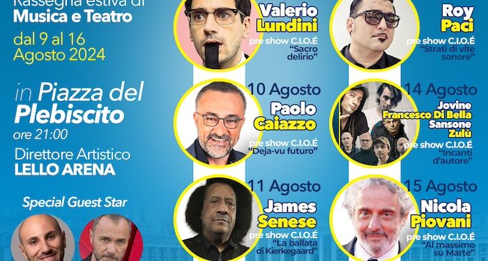 Le serate saranno presentate dall’attore Biagio Musella con gli interventi comici di Alessandro Bolide e del trio “Gli Ancora No” con le special guest Massimiliano Gallo e Vincenzo De Lucia in interventi tra teatro d’autore e comico. Poi spazio a tanta musica con il Premio Oscar Nicola Piovani, il fenomeno nazionale dell’urban jazz Serena Brancale, i ritmi latin ska del trombettista Roy Paci, la comicità surreale di Valerio Lundini, in scena con la sua live band, i concerti di diciotto tra bands e solisti partenopei dove spicca Jovine con importanti ospiti e un Gala di Danza dell’ACSI. Infine il tributo a James Senese che torna ad esibirsi al Plebiscito dove incontrerà, dopo anni, Lello Arena.
