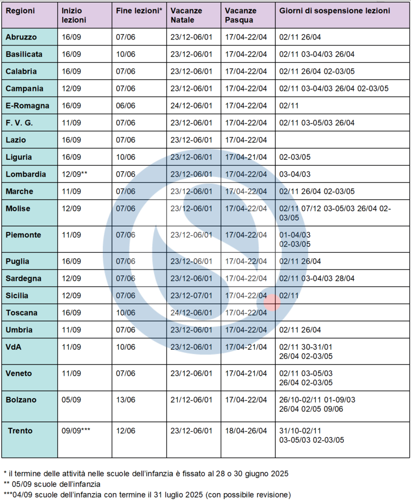 Tutte le date di inizio e fine lezioni dell’anno scolastico 2024/25, con i ponti e le festività previsti per il prossimo anno scolastico. Le scuole possono adattare i calendari scolastici deliberati dalle Regioni.