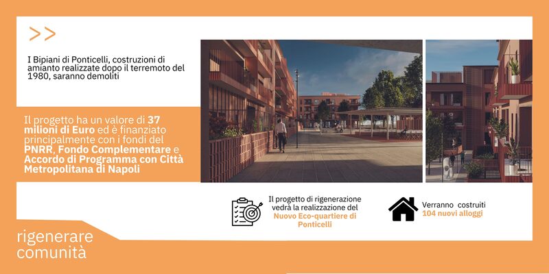 Il progetto per la realizzazione del Nuovo Ecoquartiere a Ponticelli è stato ammesso a finanziamento tramite il Fondo Complementare al PNRR, inserito nel Piano nazionale per gli Investimenti Complementari PNC, per un importo di circa 35 milioni di euro. Inoltre, l’intervento si integra con i lavori di bonifica, smantellamento, demolizione e smaltimento dei rifiuti finanziati per circa 2 milioni di euro nell’ambito di un Accordo di Programma con la Città Metropolitana di Napoli.