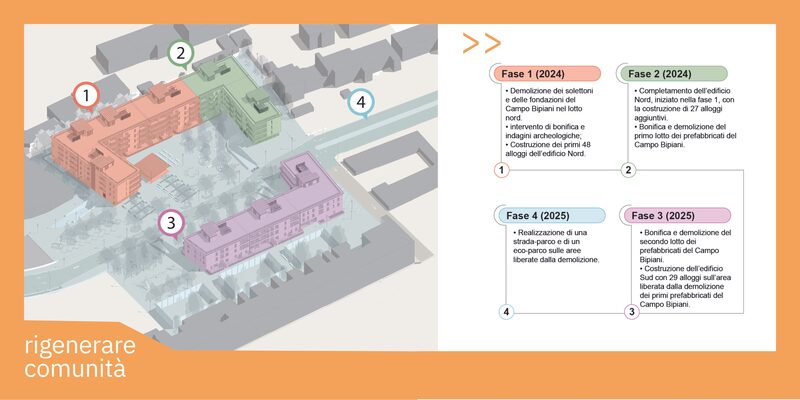 Nella fase successiva, si completerà l’edificio Nord con la costruzione di ulteriori 27 alloggi. Successivamente, sarà avviata la bonifica e la demolizione del primo lotto dei prefabbricati del Campo Bipiani, liberando l’area per iniziare la costruzione dell’edificio Sud nella fase successiva.