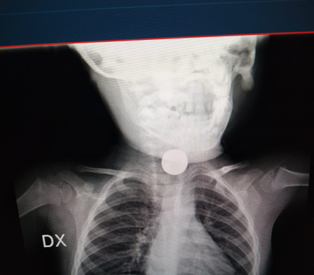 È stata la sorellina del bimbo ad accorgersi dell’ingestione di un corpo estraneo e a lanciare l’allarme. Dopo poco i primi sintomi: difficoltà nella deglutizione e abbondante salivazione.