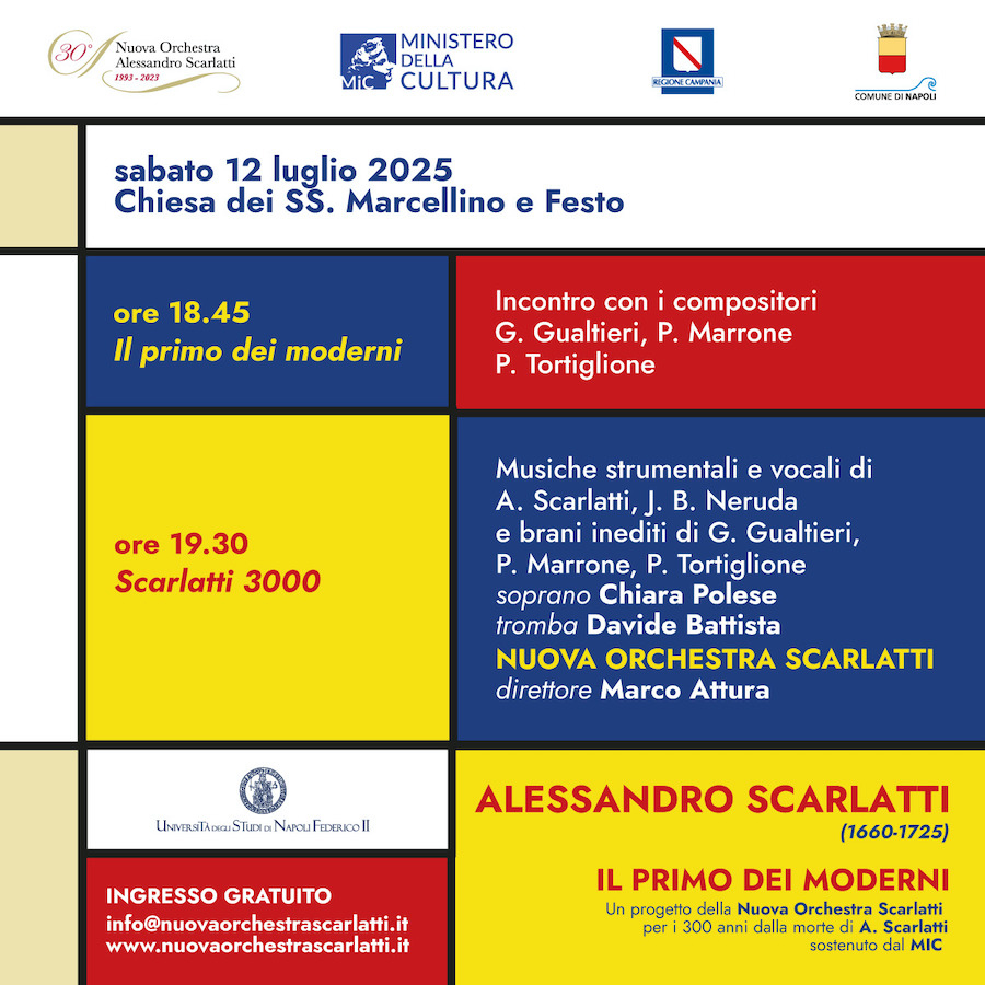 Sabato 12 luglio ore 19.30, con ingresso gratuito nella Chiesa dei SS. Marcellino e Festo, a Napoli in Largo San Marcellino 10, si terrà il concerto “Scarlatti 3000”, secondo appuntamento della rassegna “Alessandro Scarlatti il primo dei Moderni”, realizzata dalla Nuova Orchestra Scarlatti in occasione dei 300 anni dalla morte del compositore, sostenuta dal MIC.Sul palco il soprano Chiara Polese e il giovane e talentuoso trombettista Davide Battista; dirige Marco Attura. In programma concerti e cantate di Alessandro Scarlatti e J. B. Neruda.Il concerto sarà preceduto alle ore 18.45 da una conversazione aperta al pubblico con i compositori Giulio Gualtieri, Patrizio Marrone e Paolo Tortiglione, coordinata da Enzo Viccaro.