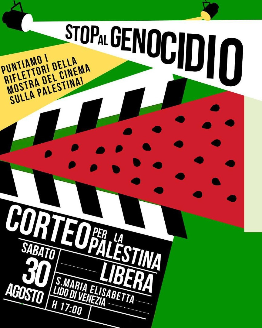 Il ritrovo è fissato alle ore 17.00 a Santa Maria Elisabetta (Lido di Venezia): da qui partirà il corteo diretto verso la Mostra del Cinema. Una scelta simbolica e politica per rompere il silenzio e puntare i riflettori della Mostra del Cinema sulla Palestina.