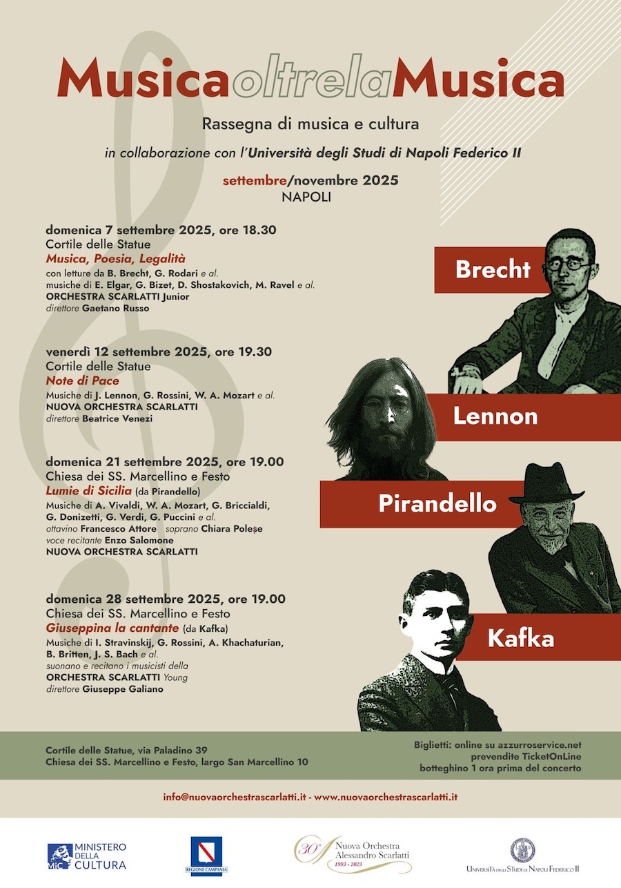 Si parte domenica 7 settembre 2025, al Cortile delle Statue ore 18.30, con Musica, Poesia, Legalità: l’Orchestra Scarlatti Junior alternerà grandi pagine di Elgar, Šostakovič, Ravel e altri alla grande poesia civile (da Brecht a Rodari): un’azione di vera politica culturale realizzata dai giovani.
