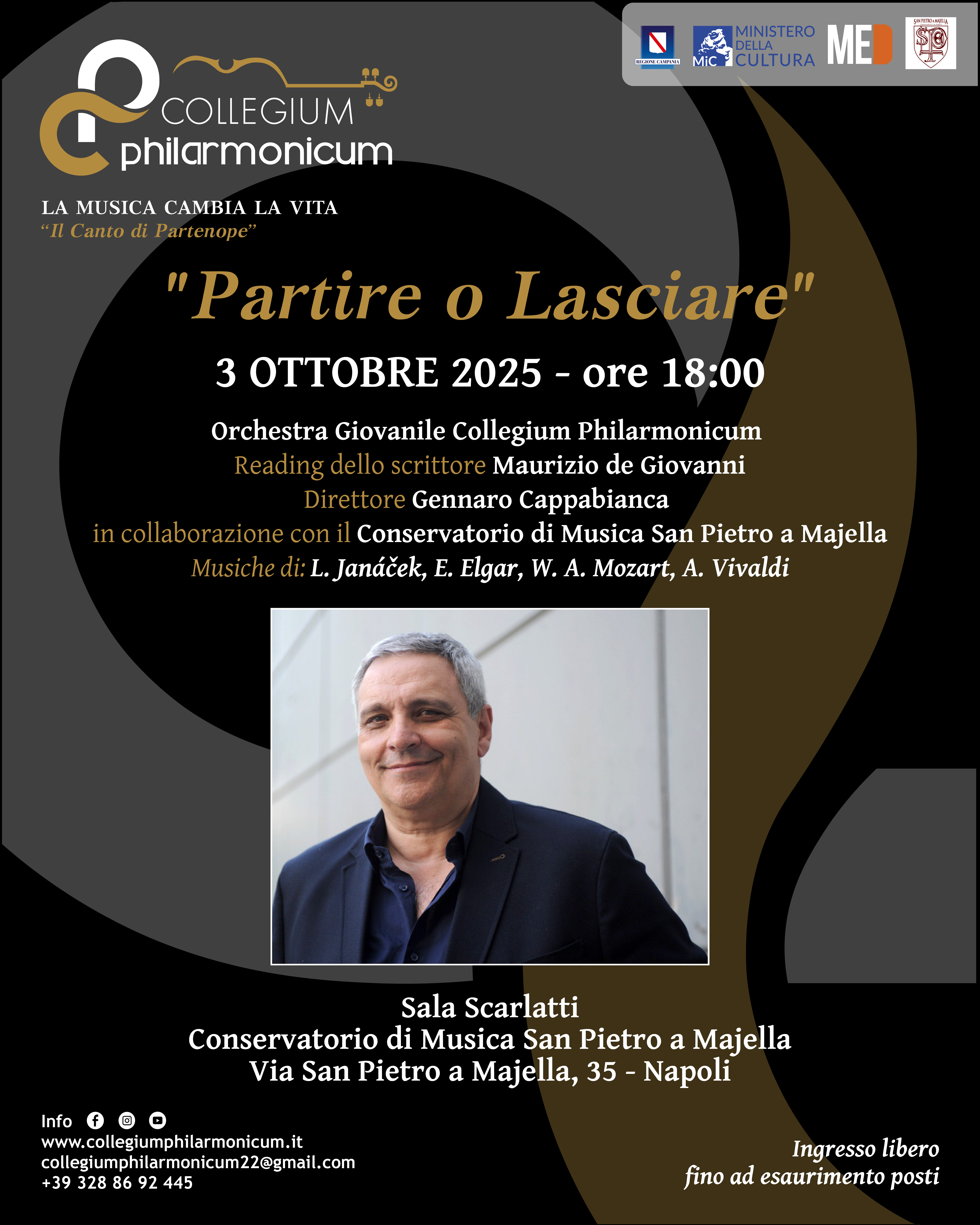 VENERDÌ 3 OTTOBRE 2025 alle ore 18.00, la prestigiosa Sala Scarlatti del Conservatorio di Musica ‘San Pietro a Majella’ di Napoliospita il reading dal titolo “Partire o lasciare“, che vedrà protagonista il popolare scrittore Maurizio de Giovanni, autore tra i più amati del panorama letterario contemporaneo.