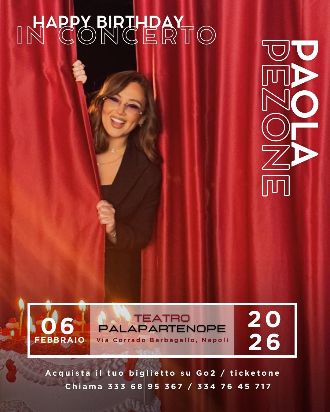 Paola Pezone torna dal vivo in concerto il 6 febbraio 2026 al Palapartenope di Napoli, data scelta non a caso: il giorno del suo compleanno. Il concerto, intitolato “Happy Birthday”, rappresenta un’occasione speciale per celebrare insieme al pubblico un percorso artistico e personale in costante crescita.