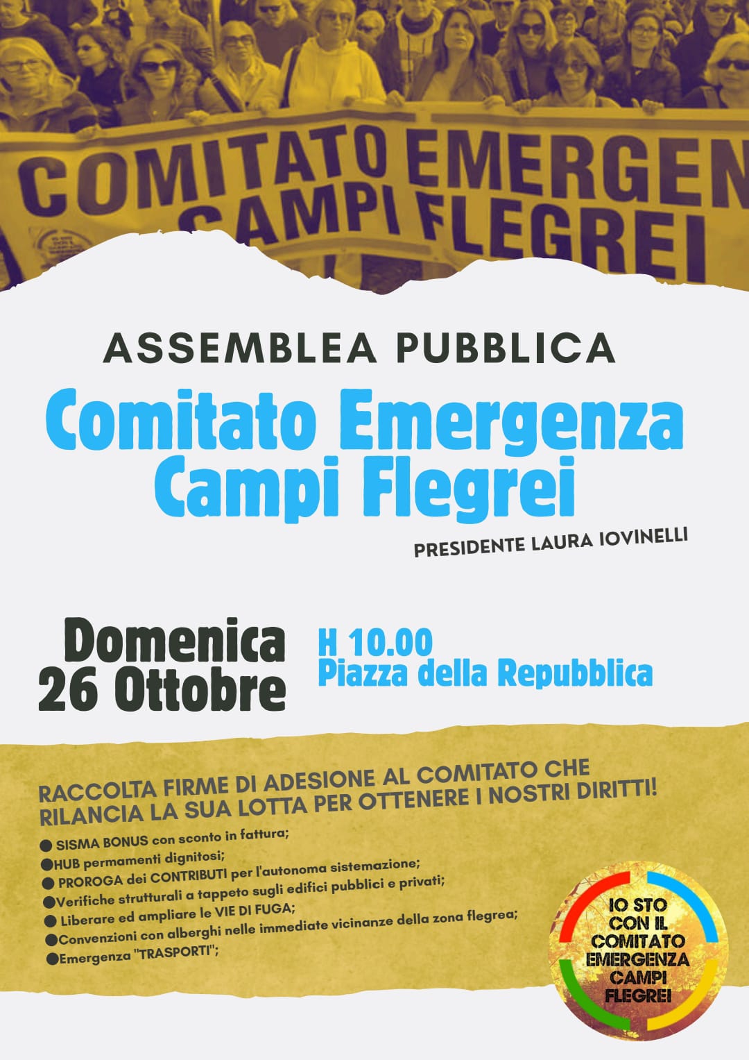 Pozzuoli si prepara a una nuova mobilitazione. Il Comitato Emergenza Campi Flegrei, guidato dalla presidentessa Laura Iovinelli, ha convocato per domenica 26 ottobre alle ore 10:00, in Piazza della Repubblica, un’Assemblea pubblica aperta a tutti i cittadini.