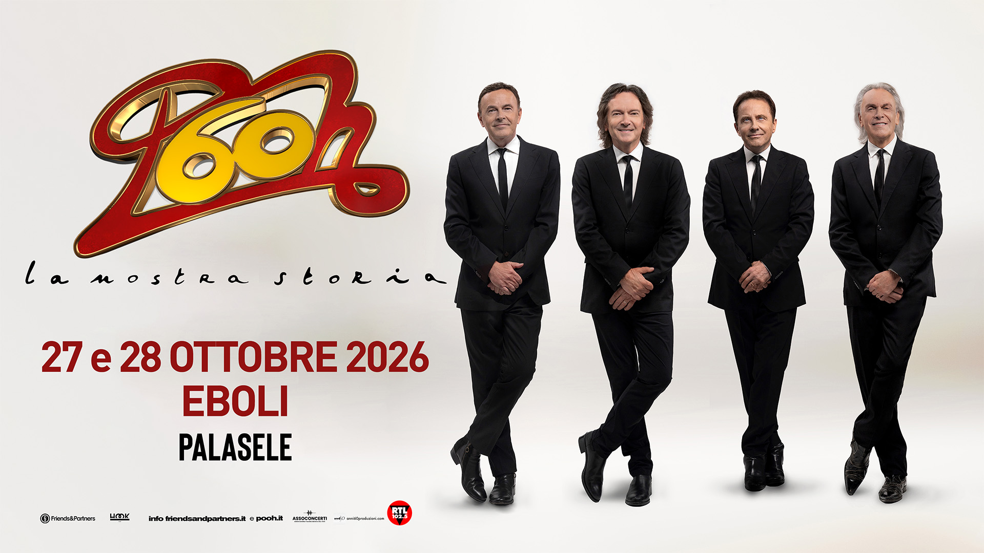 1966 – 2026. 60 anni di musica, di emozioni e di successi: nel 2026 i POOH sono pronti a tornare per quello che sarà un attesissimo anno di festeggiamenti e sorprese per il traguardo da record del loro sessantennale, che li conferma tre le band più longeve e amate di sempre. “POOH 60 – La nostra storia” sarà una serie di importanti appuntamenti live per rivivere e celebrare insieme una carriera straordinaria, un tour speciale che toccherà 6 città con doppia data, anticipati da una doppia data 0, per un totale di ben 14 date nei palasport italiani.
