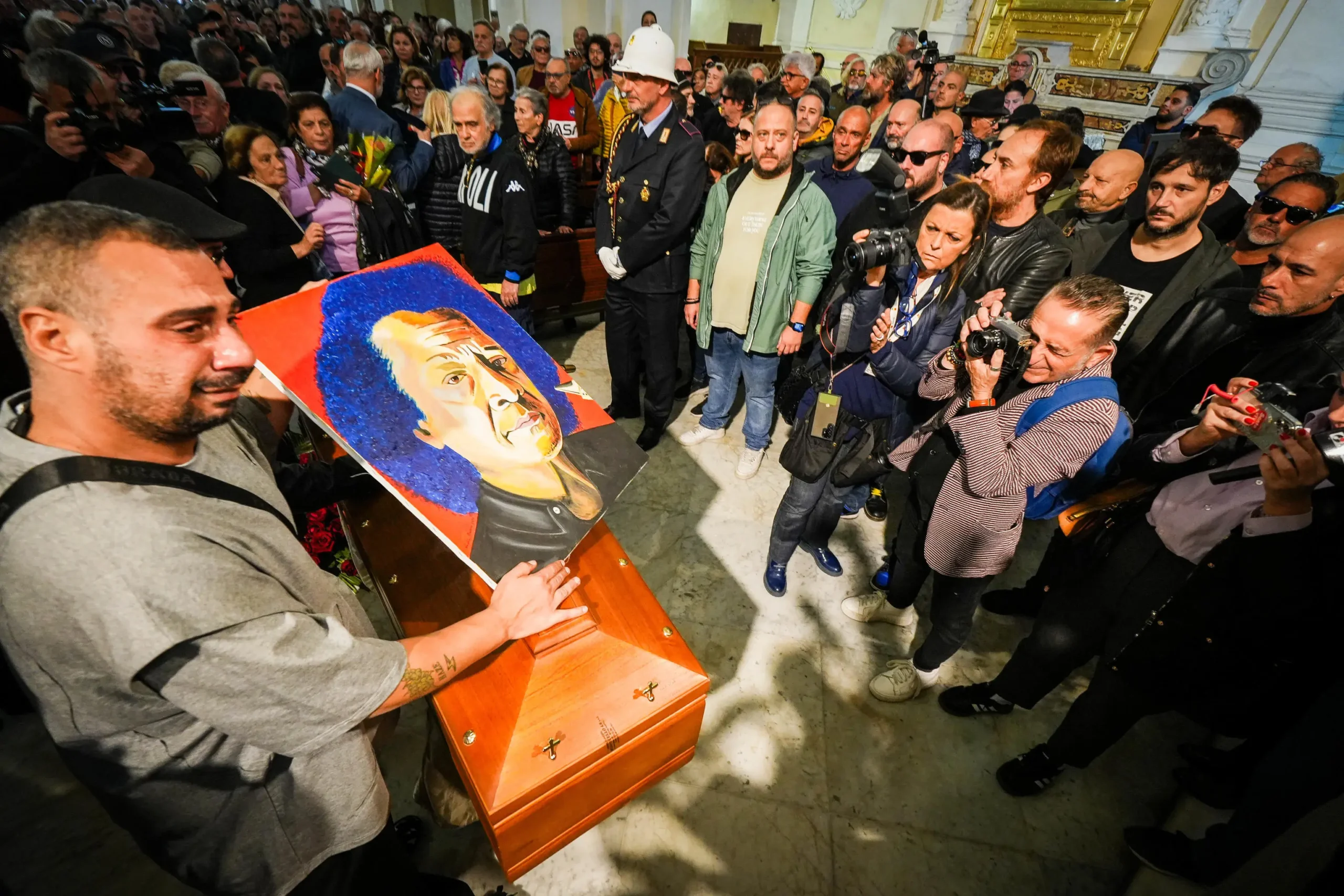 Dopo la cerimonia, la bara è stata portata a spalla lungo le vie di Miano, seguita da centinaia di persone che intonavano O’ Sanghe e Napule. Una scena di dolore e orgoglio, in perfetto stile partenopeo.