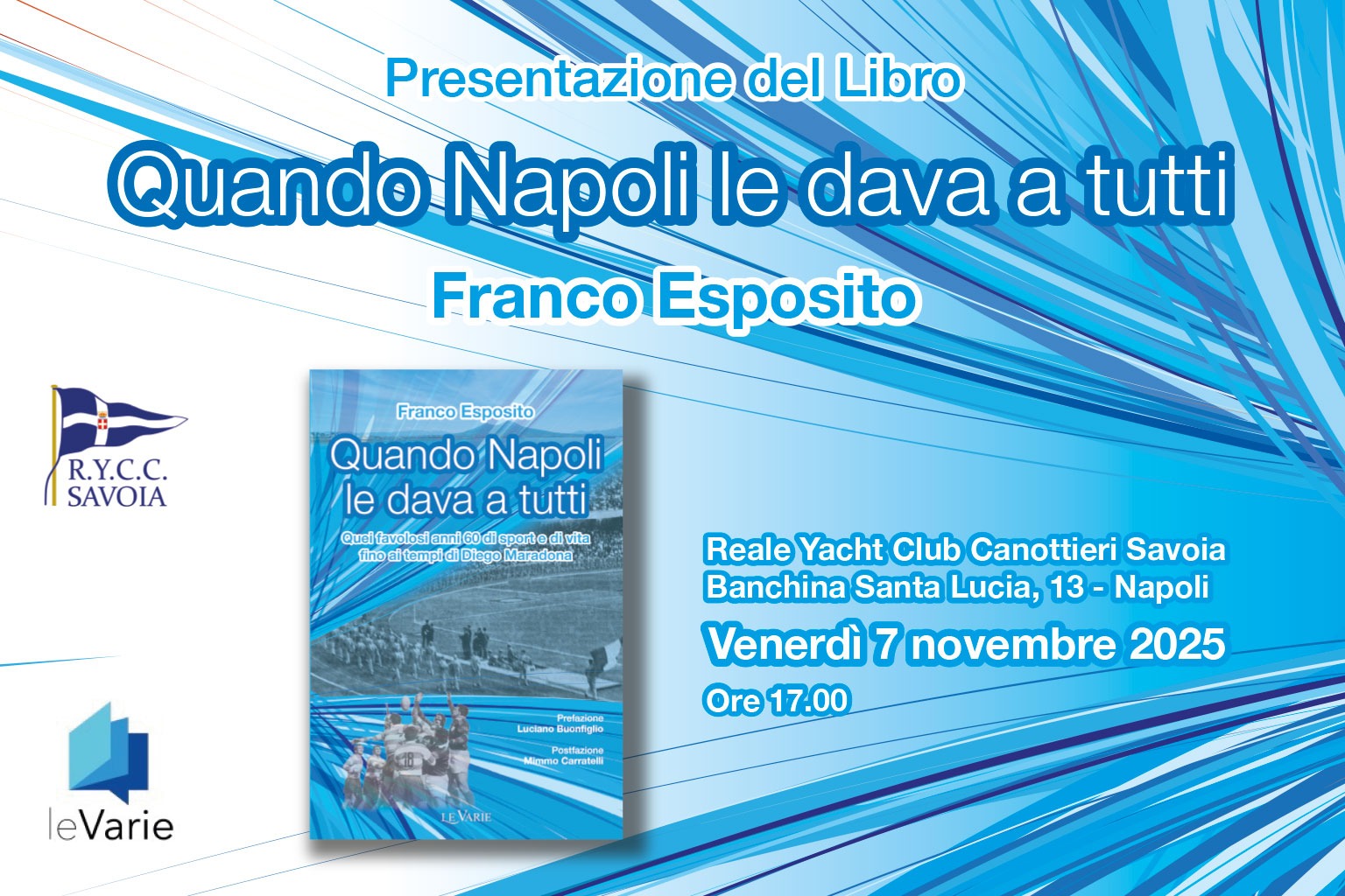 Un magnifico affresco della Napoli degli anni 60, bella e vincente come mai, che dominava in tutti gli sport, sulle ali del boom economico e sociale, rendendosi modello per tutta l’Italia. “Quando Napoli le dava a tutti – Quei favolosi anni 60 di sport e di vita fino ai tempi di Diego Maradona” è il nuovo libro di Franco Esposito, edito da LeVarie, che sarà presentato venerdì 7 novembre, alle ore 17, al Circolo Savoia, al Borgo Marinari di Santa Lucia. Insieme con l’autore interverranno il padrone di casa, il presidente del Savoia Fabrizio Cattaneo della Volta, il decano dei giornalisti sportivi napoletani, Mimmo Carratelli, autore della postfazione del volume, il presidente nazionale Ussi Gianfranco Coppola, l’ex direttore di Sky Sport Massimo Corcione, il giornalista ed editore di LeVarie Marco Lobasso. L’incontro sarà moderato dal giornalista Marco Caiazzo. Sarà un pomeriggio tra amici, campioni, ex campioni e appassionati di sport e della storia della nostra Napoli che hanno già annunciato la propria presenza al Circolo Savoia.
