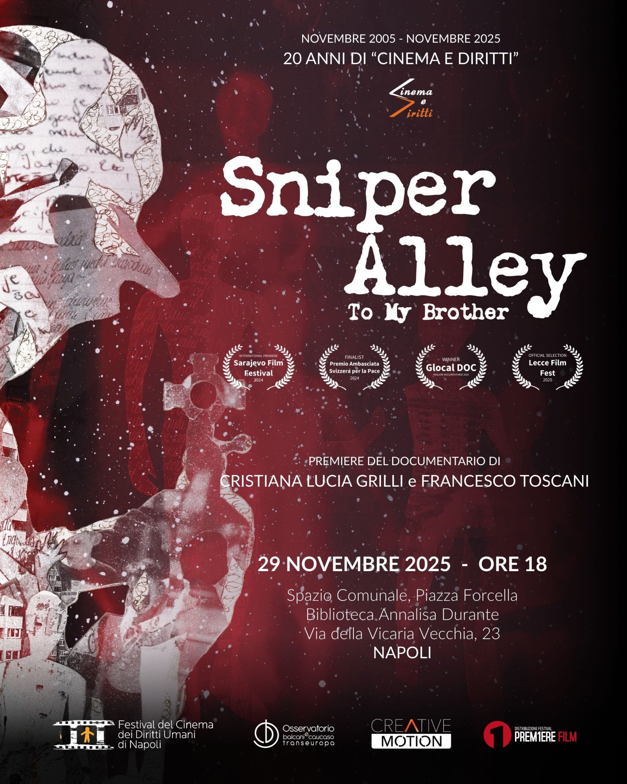 “Per la forza con cui intreccia memoria personale e storia collettiva, restituendo allo spettatore uno sguardo vivo e necessario su ciò che la guerra lascia e ciò che la memoria può ancora salvare. Attraverso la ricerca di un fratello perduto, il film costruisce un linguaggio universale che parla di lutto, umanità e rinascita”. Con questa motivazione il docufilm ‘Sniper Alley – To My Brother‘ si è aggiudicato il premio principale come miglior documentario al Glocal DOC 2025 di Varese. Un riconoscimento prestigioso per il lavoroincentrato sulla storia di Džemil Hodžić e sul suo progetto “Sniper Alley Photo” (che ha l’obiettivo di ricostruire la memoria dell’assedio di Sarajevo attraverso le immagini dei più grandi fotoreporter di guerra) nato dopo la tragica perdita del fratello Amel, ucciso da un cecchino a soli 16 anni. Il docufilm – realizzato dallo studio di produzione con sede a Pescara Creative Motion che da anni porta avanti progetti di impegno civile e culturale a livello internazionale – continua a essere proiettato in contesti autorevoli. Dopo la presentazione nell’aula magna dell’Università di Anversa seguirà la Prima Nazionale italiana, con la proiezione in occasione del XVII Festival del Cinema dei Diritti Umani di Napoli alla presenza di numerosi ospiti.