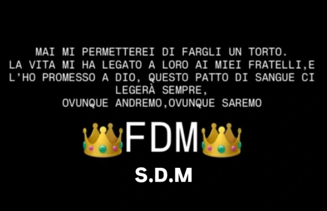 “Mai mi permetterei di fargli un torto. La vita mi ha legato a loro, ai miei fratelli. – si legge nella storia pubblicata su Instagram, pregna di errori grammaticali – L’ho promesso a Dio, questo patto di sangue ci legherà per sempre. Ovunque andremo, ovunque saremo”. Il messaggio, suggellato dalla sigla “F.D.M.” (famiglia de Micco, ndr) racchiusa tra due corone, a simboleggiare la leadership del clan, e dalla sigla “S.D.M.” (Salvatore De Micco, ndr) per rendere ancora più esplicito e inequivocabile il destinatario di quella dedica, assume un valore tutt’altro che simbolico. Non sono semplici parole, ma un messaggio chiaro e plateale che rilancia il legame tra i gregari a piede libero e i boss fondatori del clan.