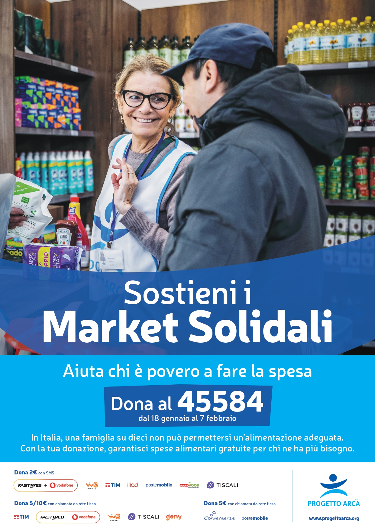 Dal 18 gennaio al 7 febbraio è possibile inviare un sms o chiamare da rete fissa il numero solidale 45584 per sostenere concretamente l’offerta dei Market solidali e contribuire a garantire generi di prima necessità a chi si trova in situazioni di disagio economico ed aumentare il numero di beneficiari in ogni città in cui i market sono presenti.